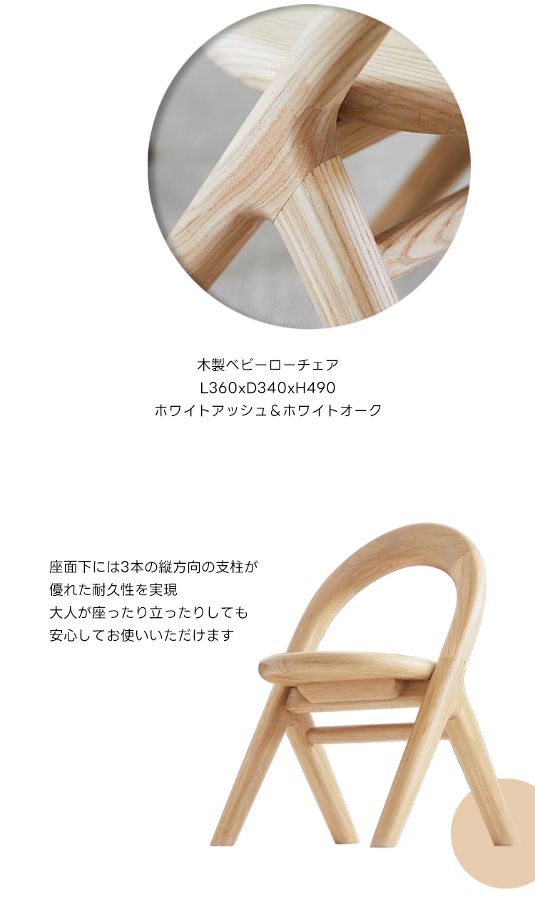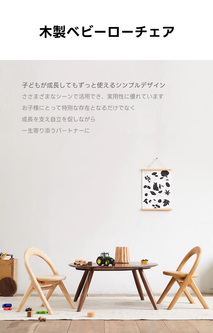 - 【成長を支えるデザイン】:この木製ベビーローチェアは、子どもの成長を支えながら長く使えるように設計されています。滑らかなリング型の背もたれは、寄りかかったときの快適さを提供し、丸みを帯びたデザインでお子様が背もたれをつかんで歩く姿も愛らしく感じられます。