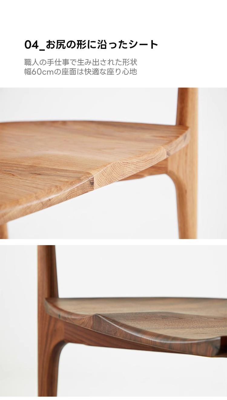 - 【快適な使用体験】:幅60cmの座面は職人の手仕事によるもので、お尻の形に沿ったデザインが快適な座り心地を実現。組み立て不要の完成品としてお届けし、届いたその日からすぐにご使用いただけます。