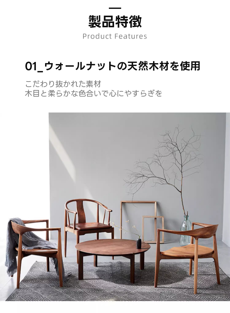 - 【高品質な素材と職人技】ウォールナットの天然木材を使用し、木目の美しさと柔らかな色合いが特徴です。職人の手によって磨き上げられた滑らかな曲線が、安心感と安全性を提供します。
