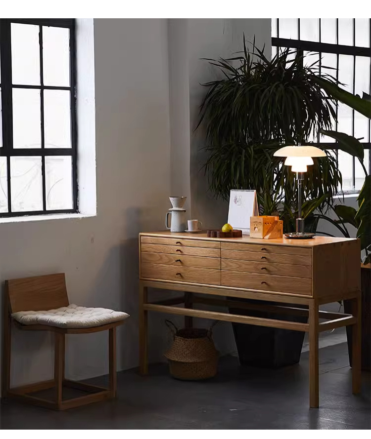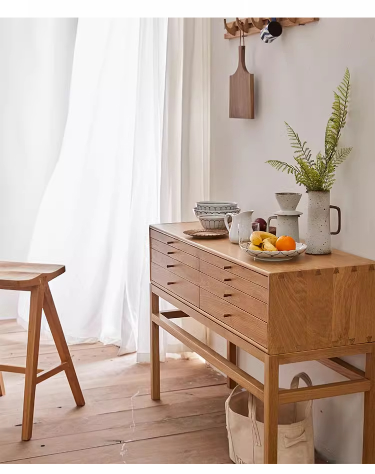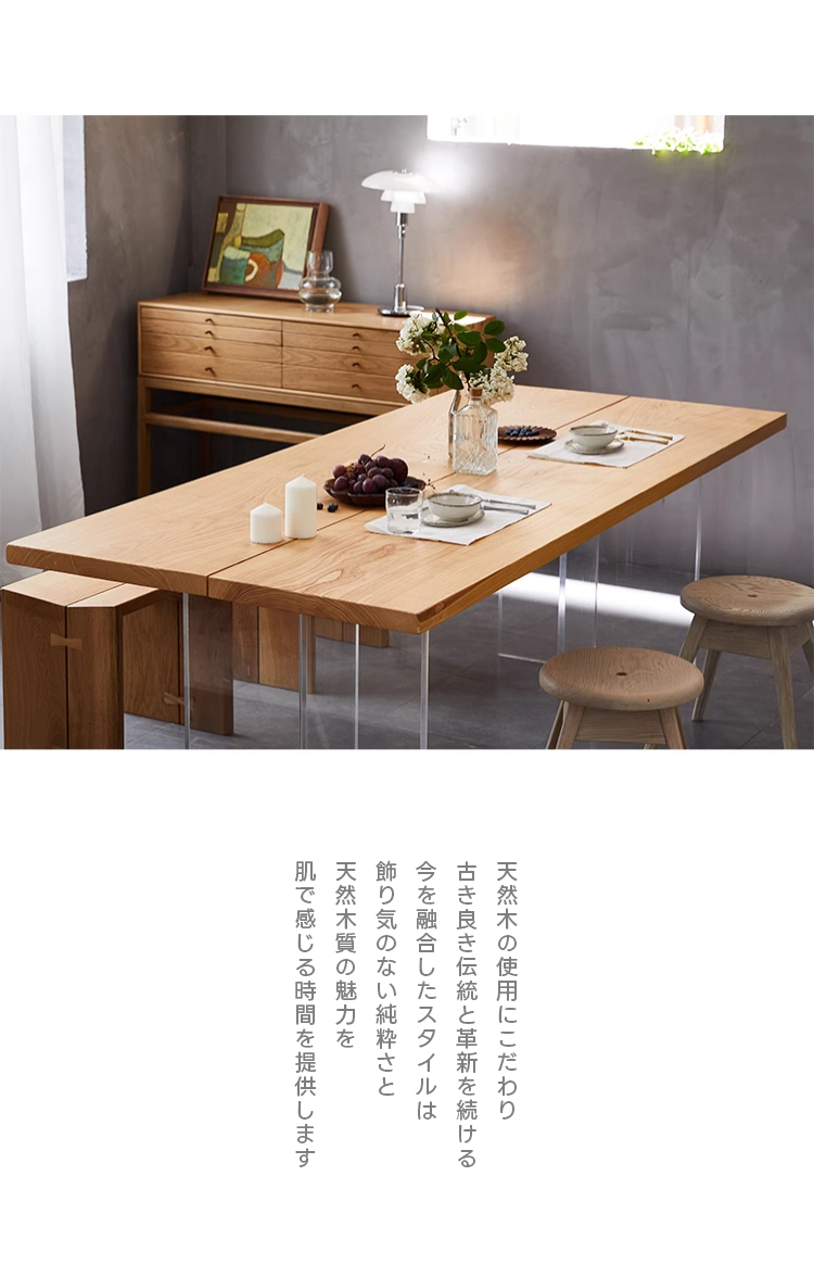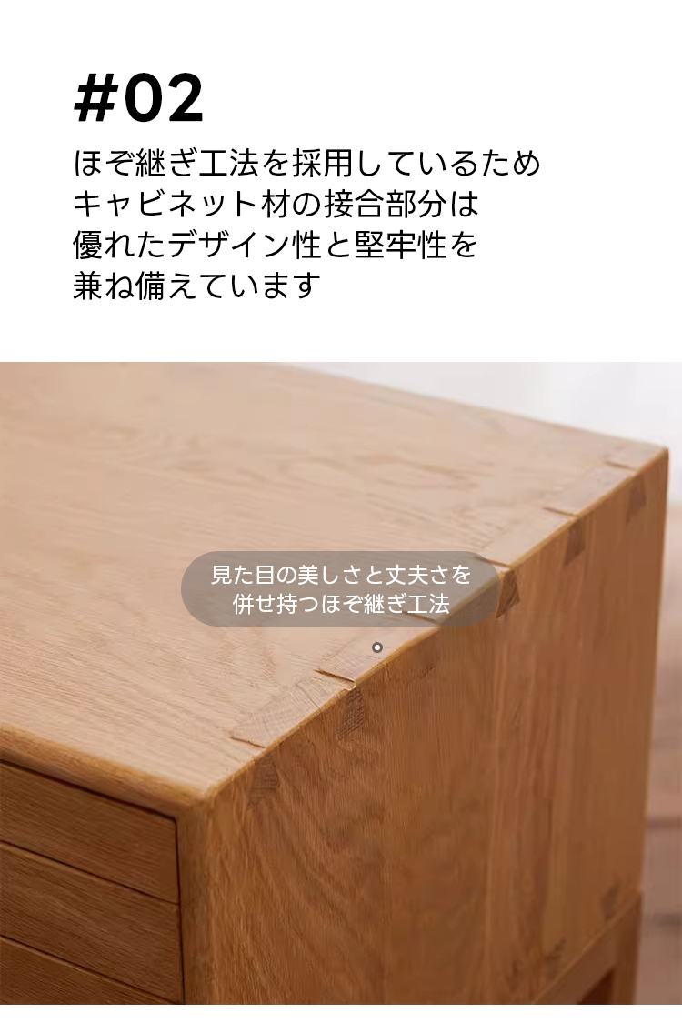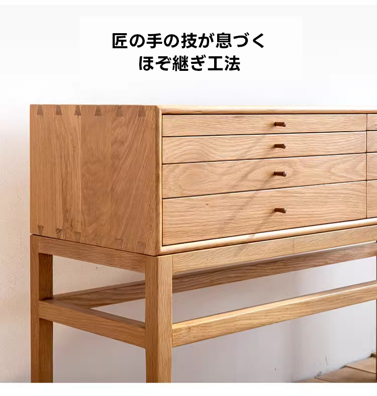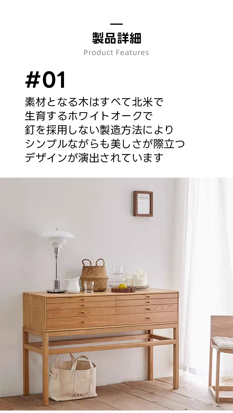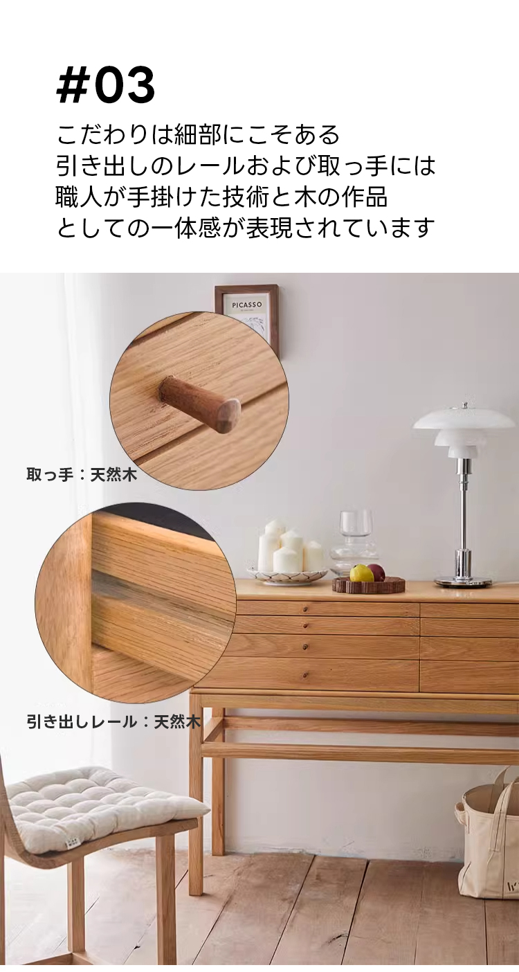 - 【高品質な素材と職人技】北米産のホワイトオークを使用し、釘を使わないほぞ継ぎ工法で作られたこのテーブルは、耐久性と美しさを兼ね備えています。引き出しのレールや取っ手にも天然木を使用し、細部にまでこだわっています。