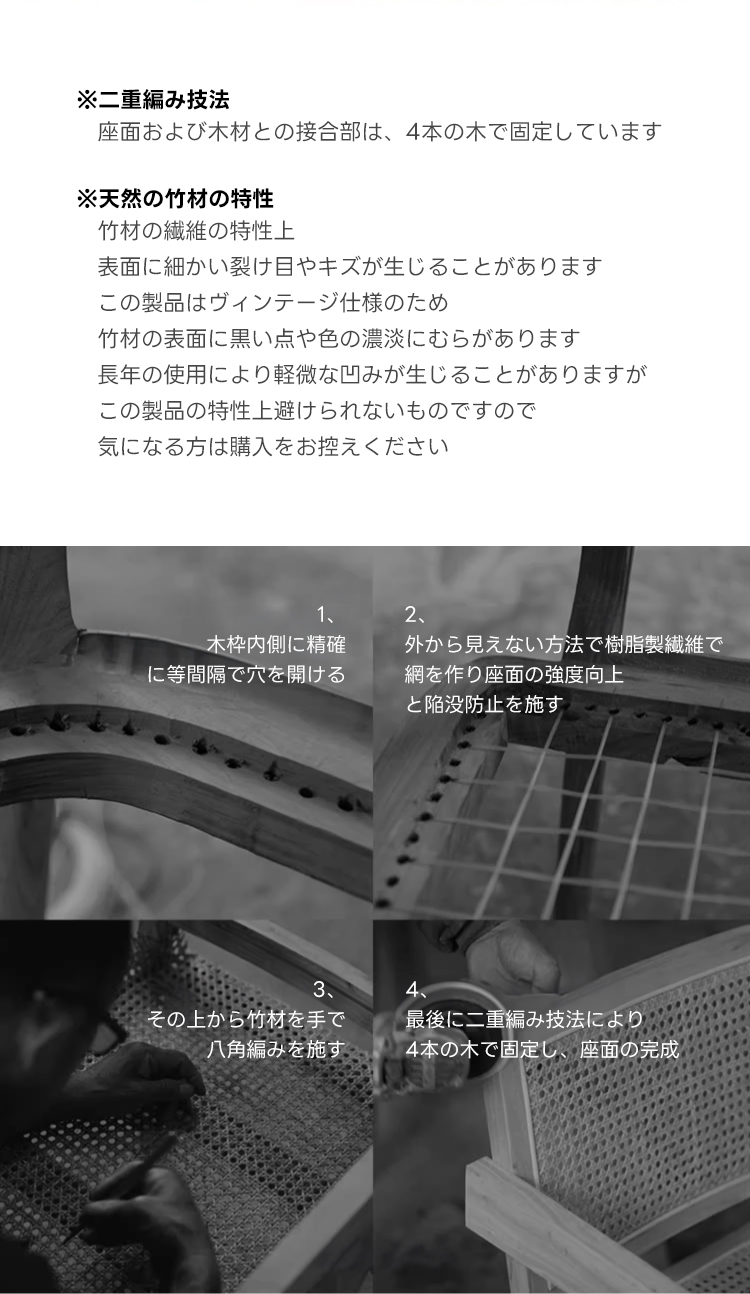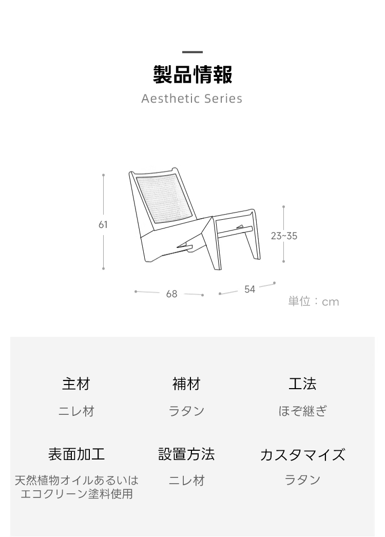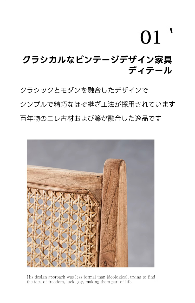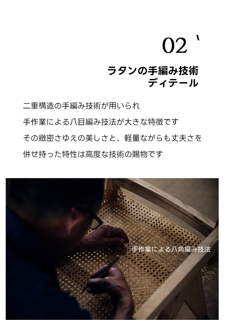 - 【高品質な素材と技術】主材には耐久性の高いニレ材を使用し、補材にはラタンを採用しています。ほぞ継ぎ工法により、シンプルでありながらも精巧な仕上がりを実現しています。ラタンの手編み技術が施され、軽量でありながらも頑丈です。