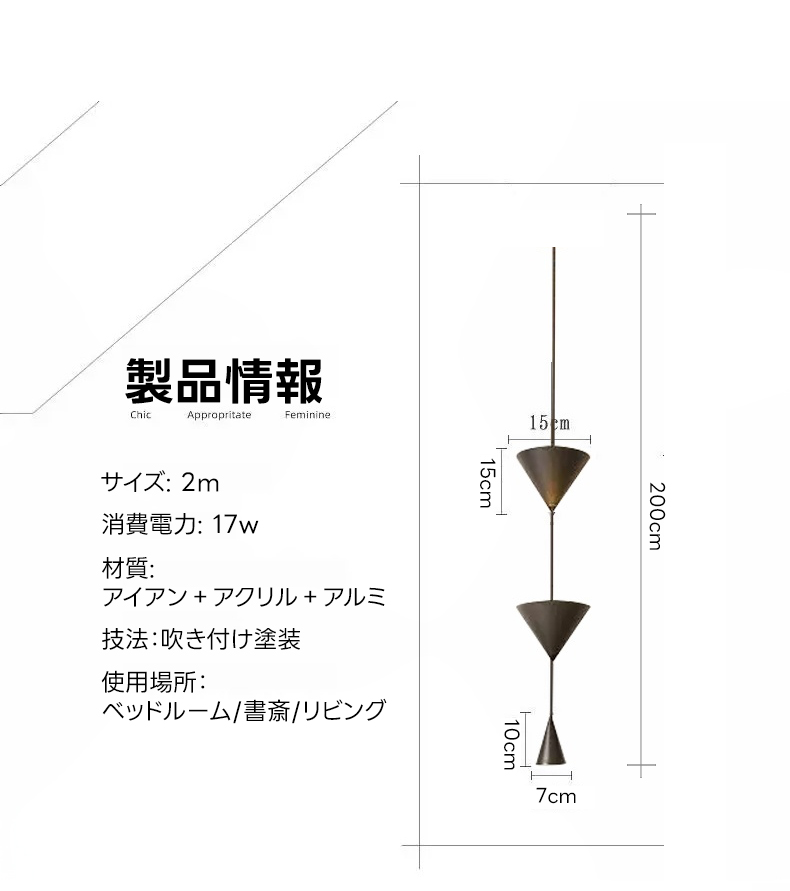 - 【高品質な素材と設計】耐久性の高い鉄を使用し、長くご使用いただけます。全長2メートルで天井から吊り下げ可能、シェードの直径は15cmでコンパクトながらも存在感があります。