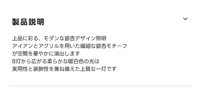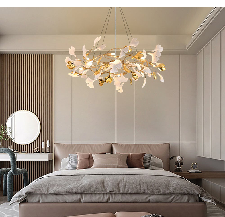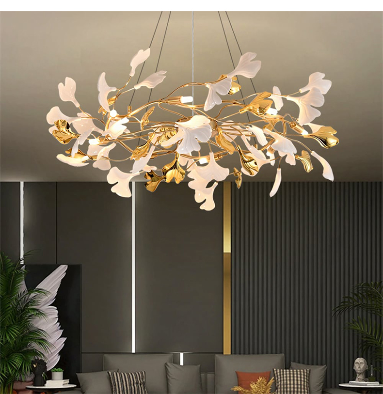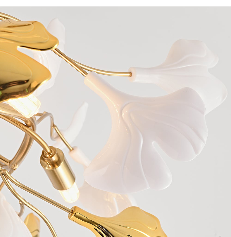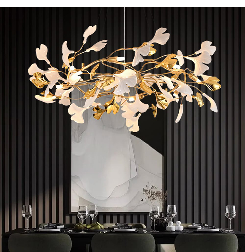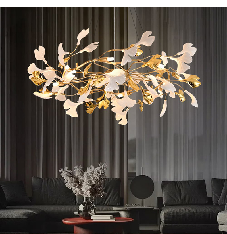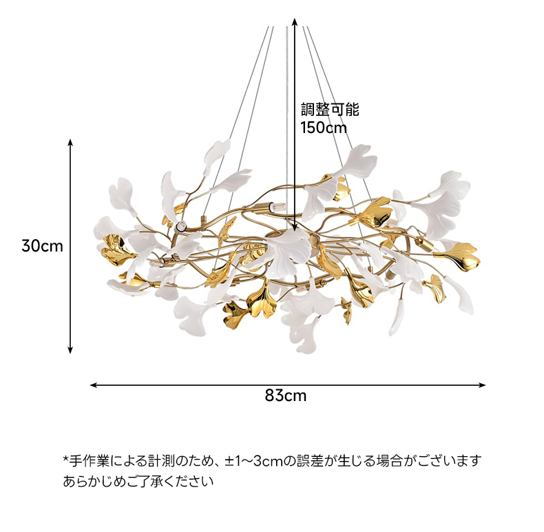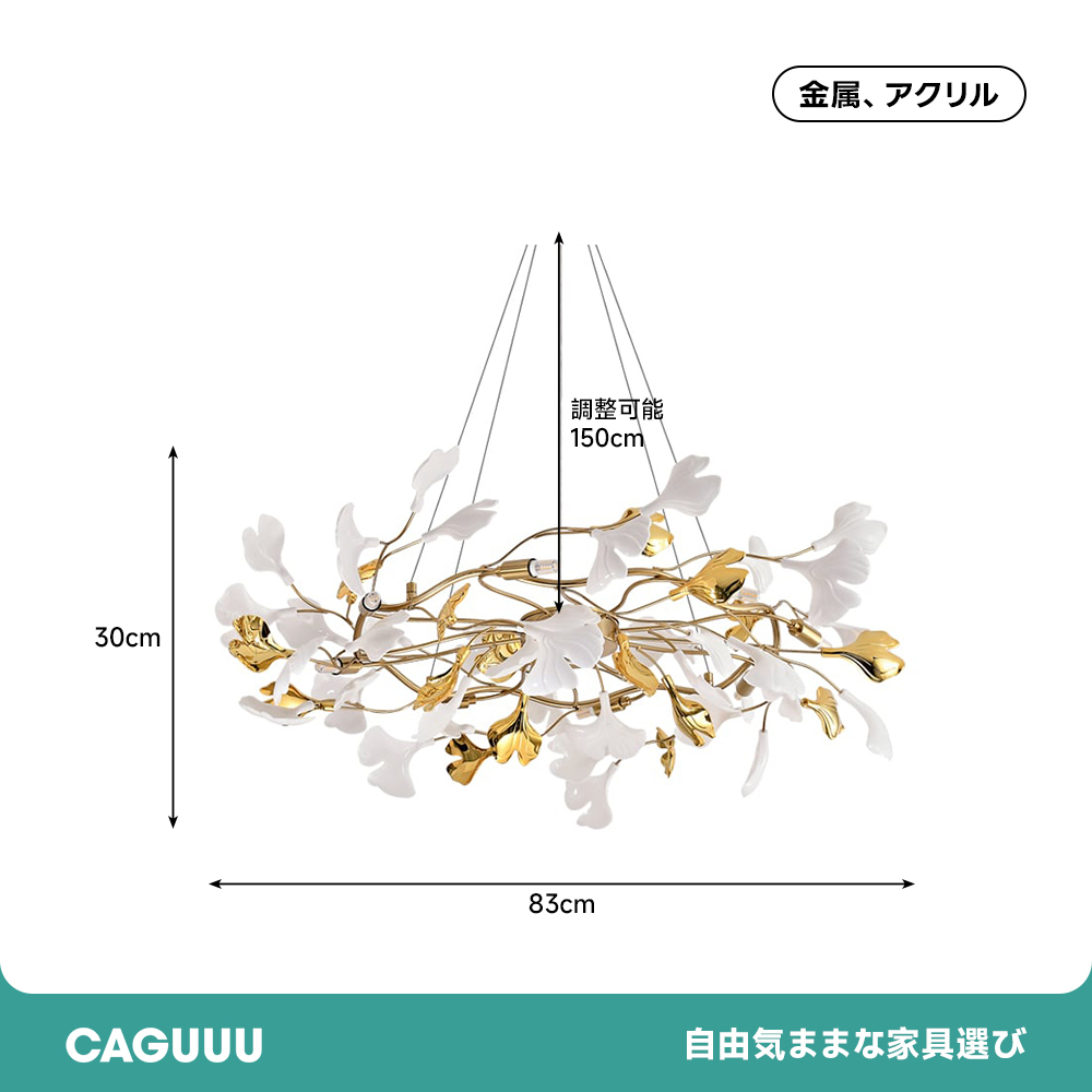 - 【豪華な照明デザイン】:イチョウシャンデリアは、ゴールドの金属フレームとアクリル素材を使用し、ラグジュアリーな雰囲気を演出します。イチョウの葉をモチーフにした不規則なデザインが特徴で、空間に華やかさを加えます。