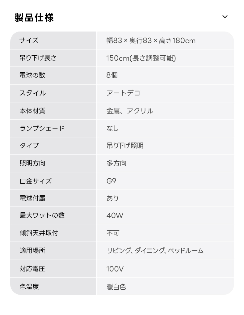 - 【多様な適用シーン】:リビングやダイニング、ベッドルームに最適なこのシャンデリアは、8個の電球が暖白色の柔らかな光を提供し、実用性と装飾性を兼ね備えています。カップルやファミリーの生活空間をより豊かにします。
