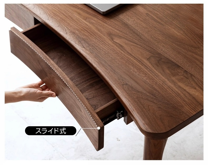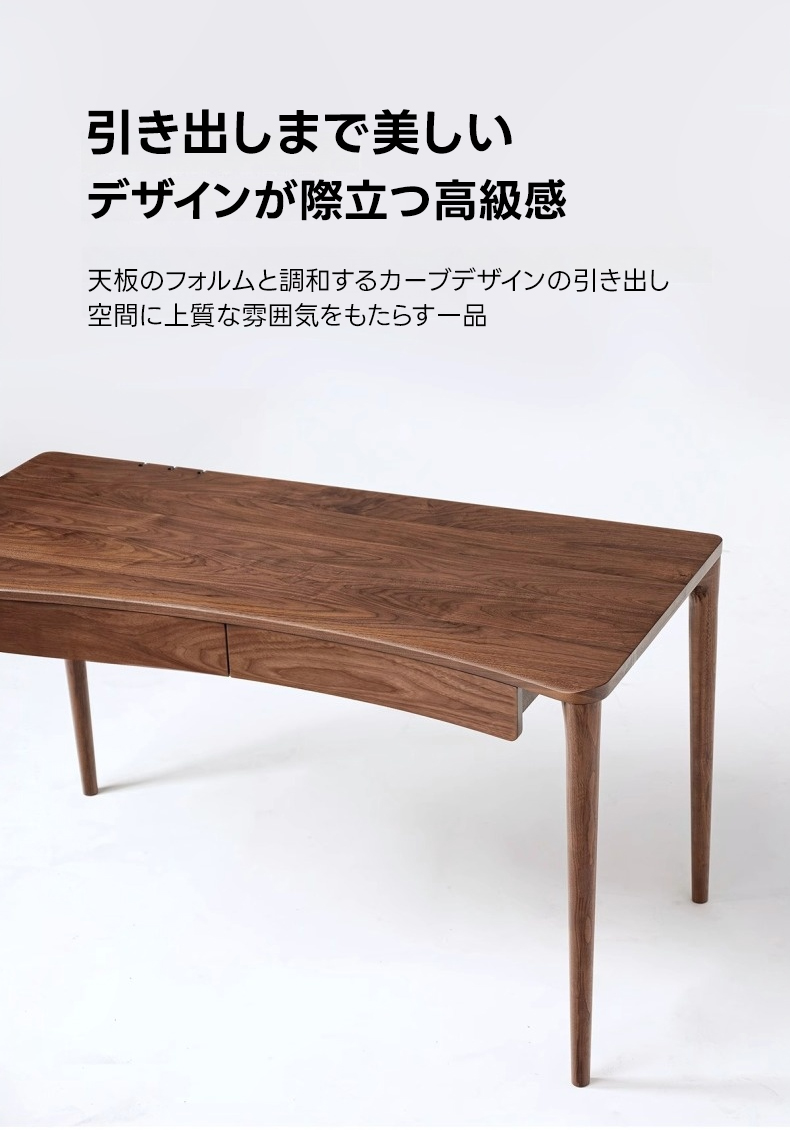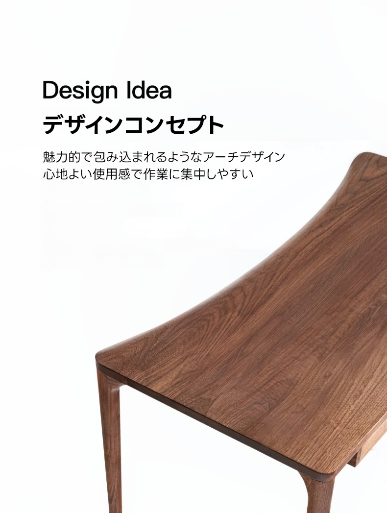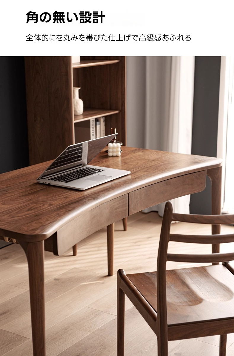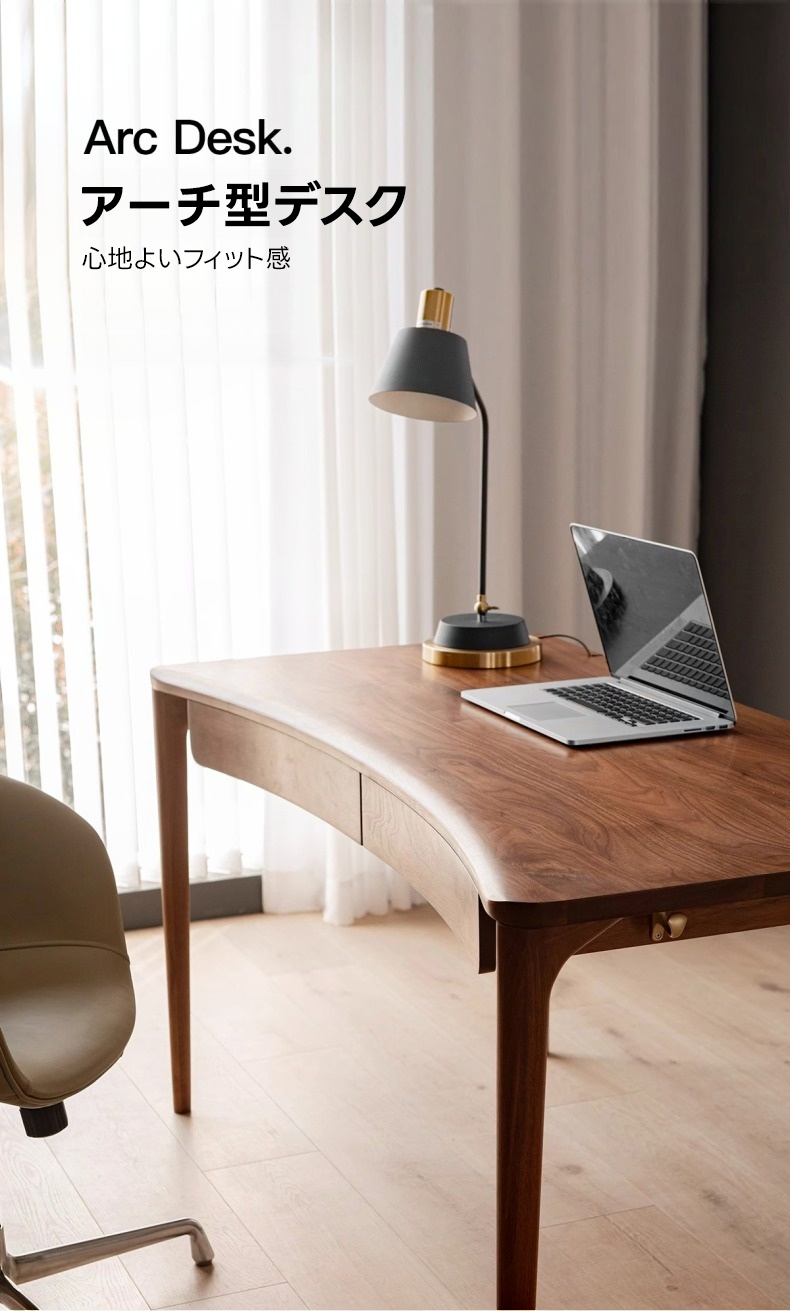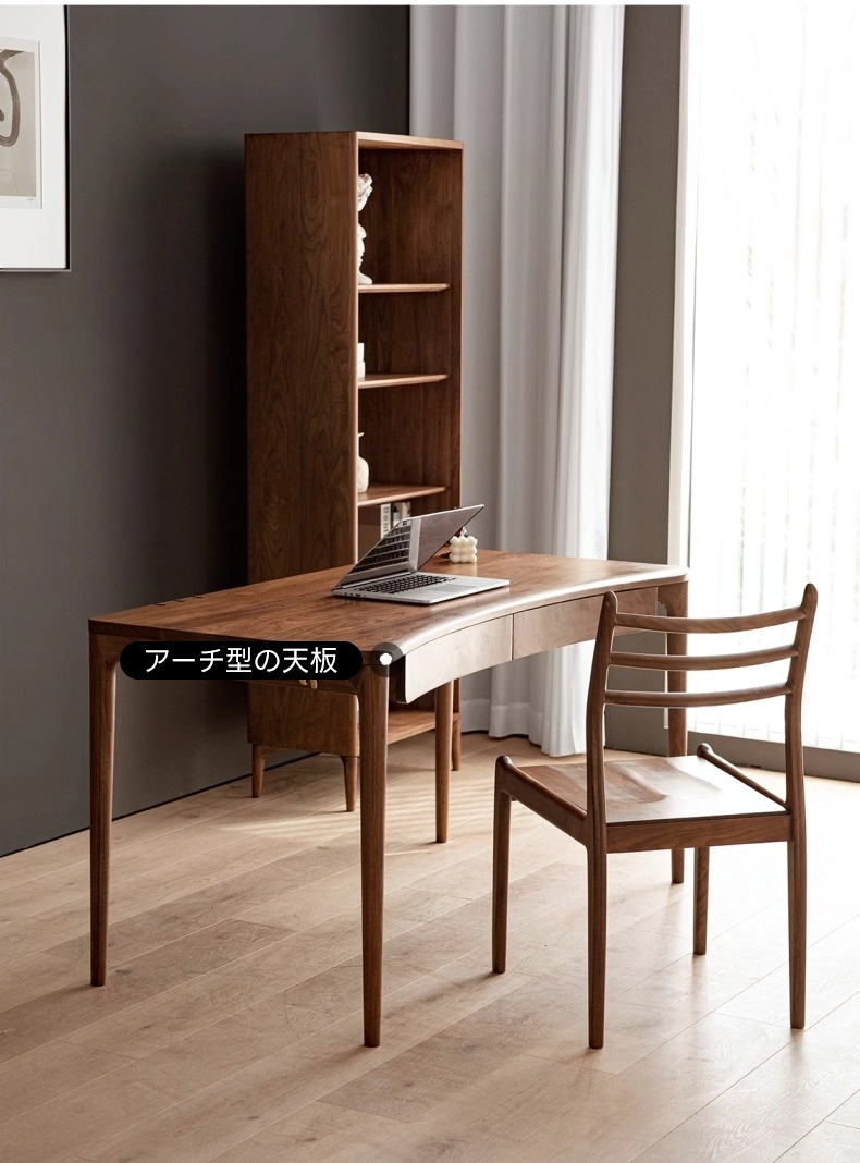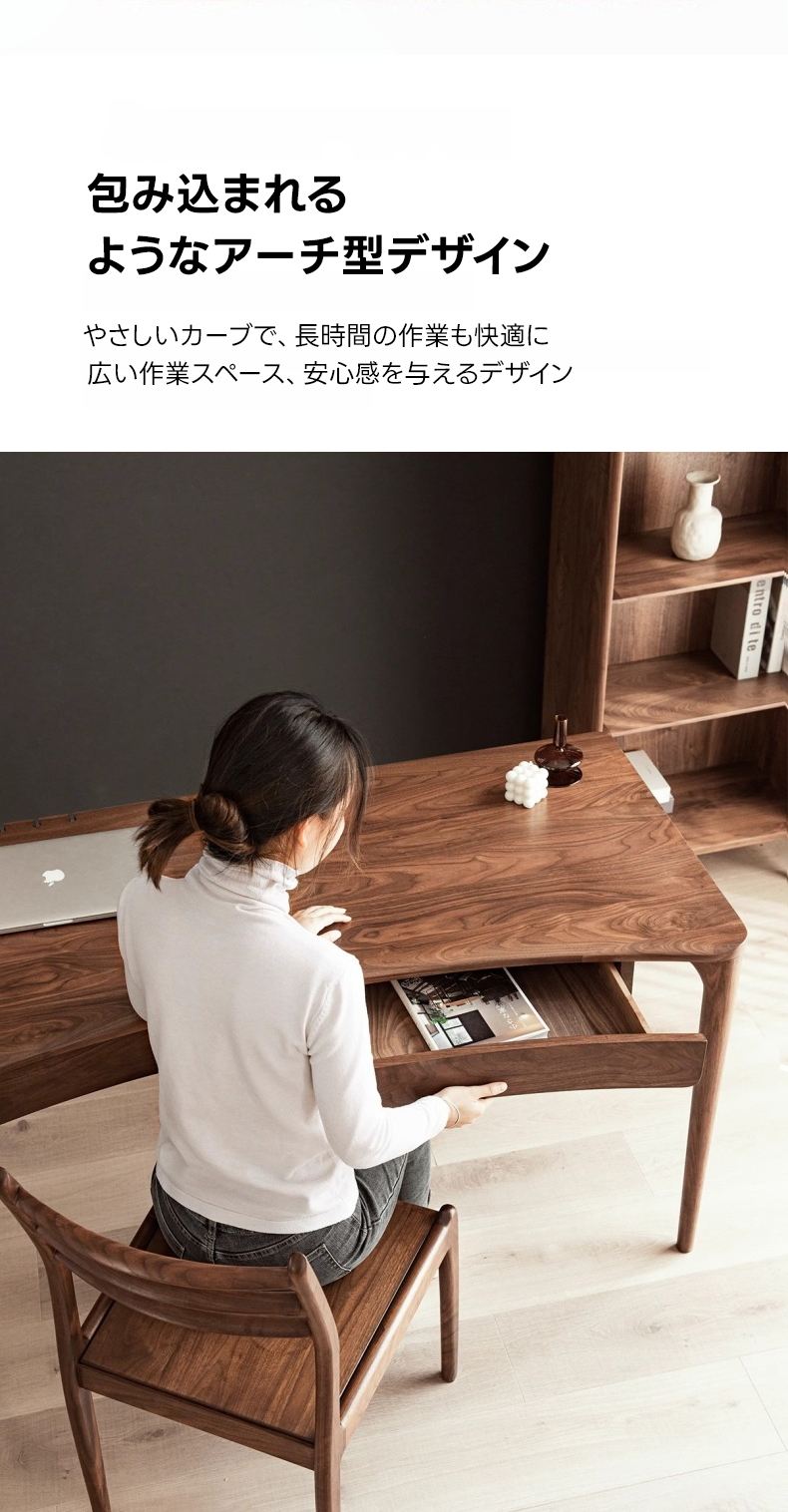 - 【フィット感のあるアーチ型デザイン】ブラックウォールナット材ワーキングデスクは、身体にフィットするアーチ型デザインを採用。長時間の作業でも快適に過ごせるよう、優しいカーブがストレスを軽減します。デスクワークをより効率的にするための理想的な選択です。