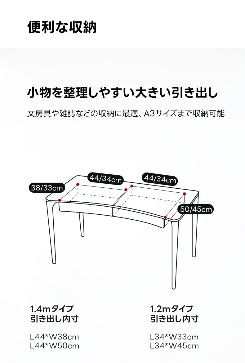 - 【便利な収納機能】スライド式の引き出しが付いており、文房具や雑誌などの収納に最適です。A3サイズまで収納可能で、デスク周りをすっきりと保ちます。さらに、配線スリットとサイドフックが付属し、機能性を高めています。