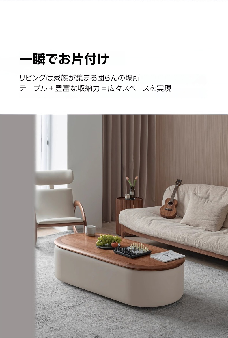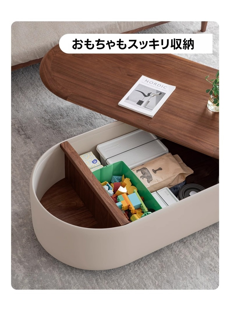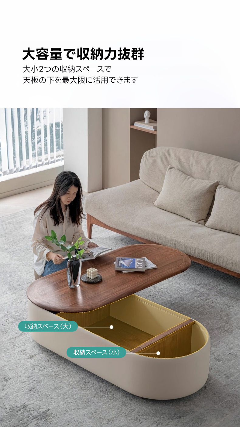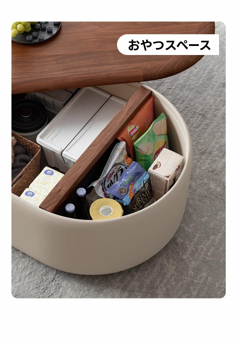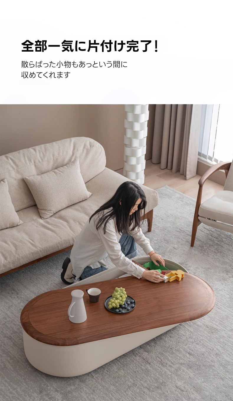 - 【広々とした収納スペース】:テーブルの下には大小2つの収納スペースがあり、日用品やおもちゃ、お菓子などをすっきりと収納できます。仕切りが少ないため、大きなアイテムも自由に収納可能で、リビングをすっきりと保つことができます。
