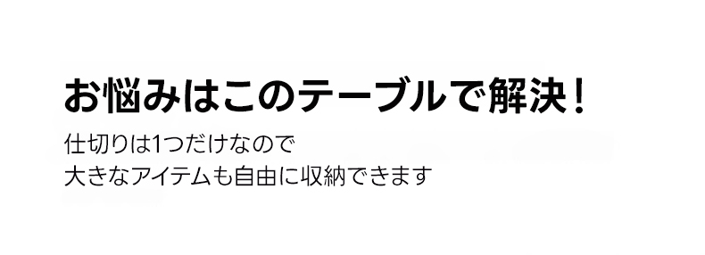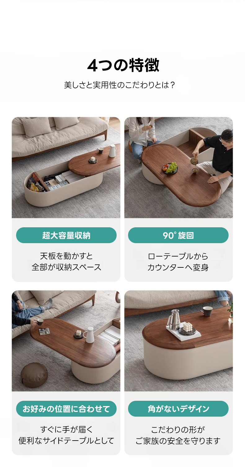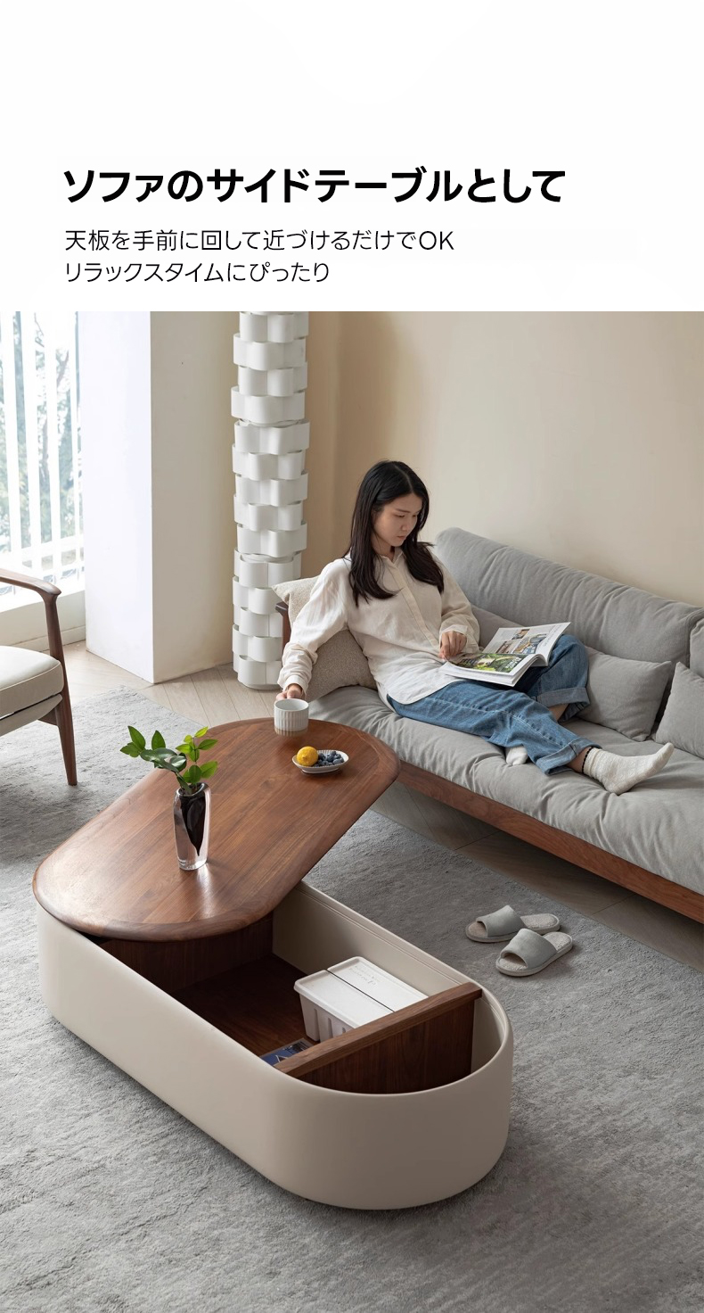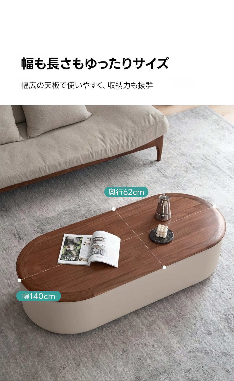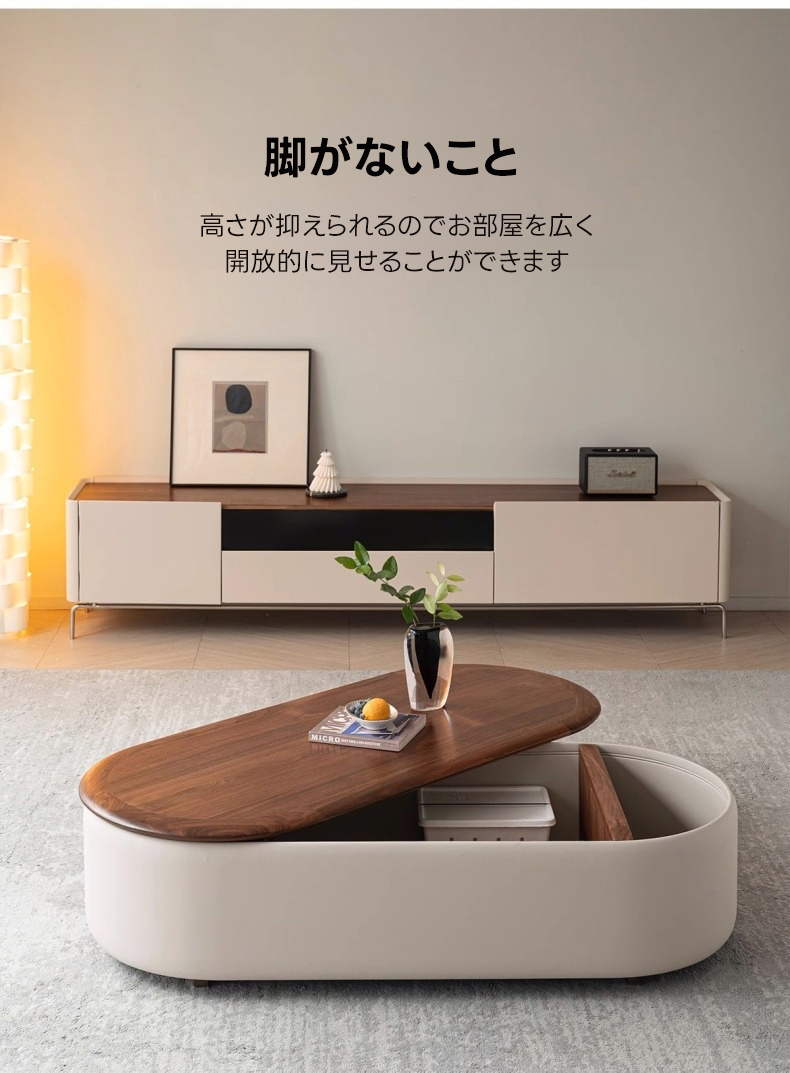 - 【広々とした収納スペース】:テーブルの下には大小2つの収納スペースがあり、日用品やおもちゃ、お菓子などをすっきりと収納できます。仕切りが少ないため、大きなアイテムも自由に収納可能で、リビングをすっきりと保つことができます。