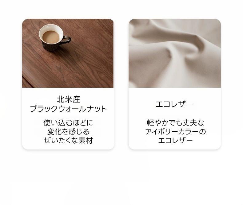 - 【高品質な素材とデザイン】:北米産ブラックウォールナットを使用した天板は、使い込むほどに味わいが増し、長く愛用できる逸品です。エコレザーのキャビネット側面は、軽やかで耐久性に優れたアイボリーカラーで仕上げられています。