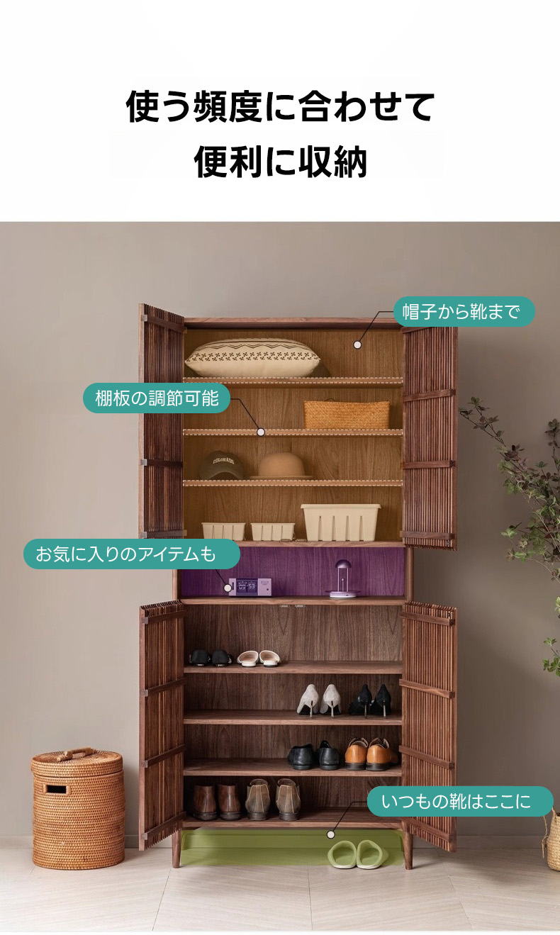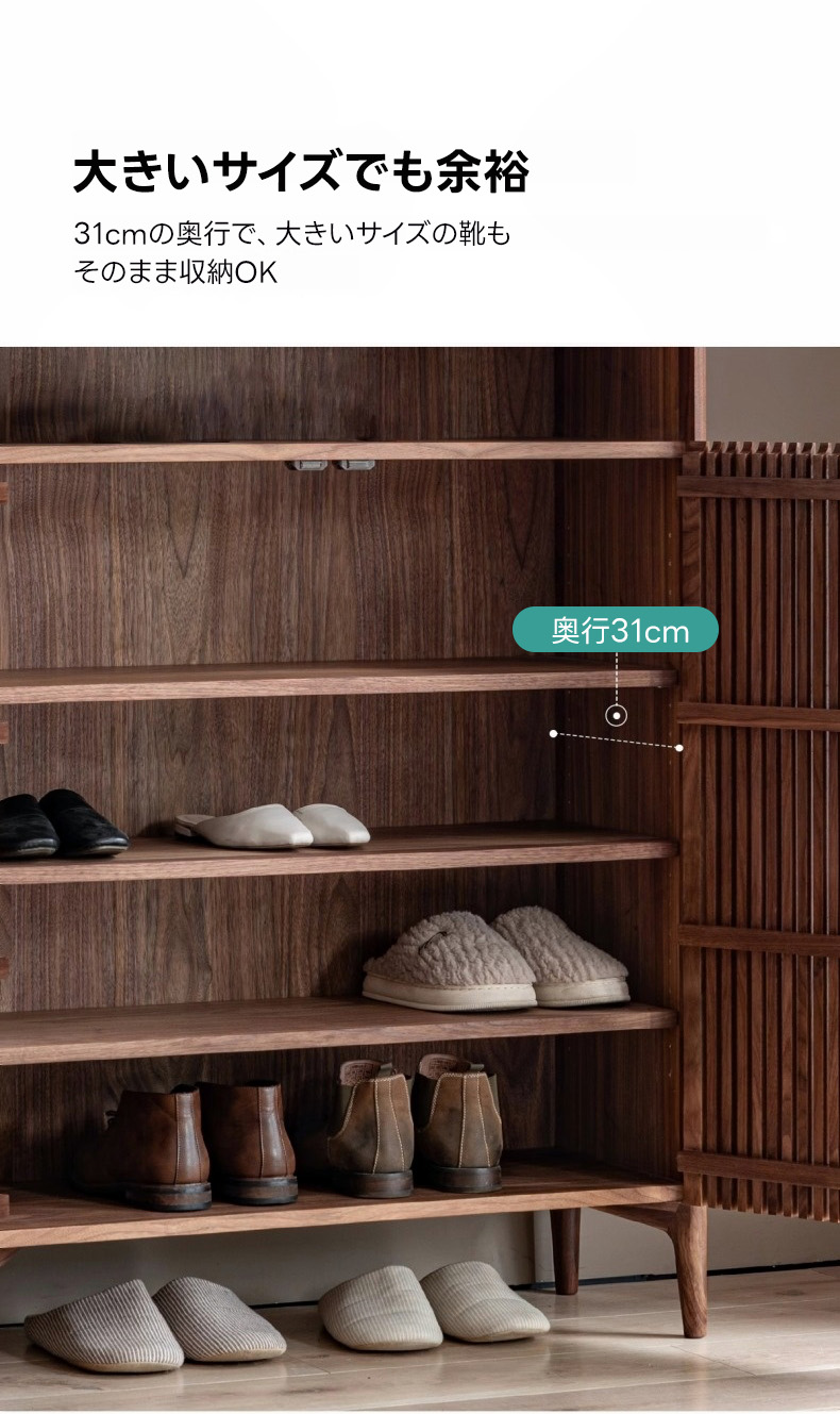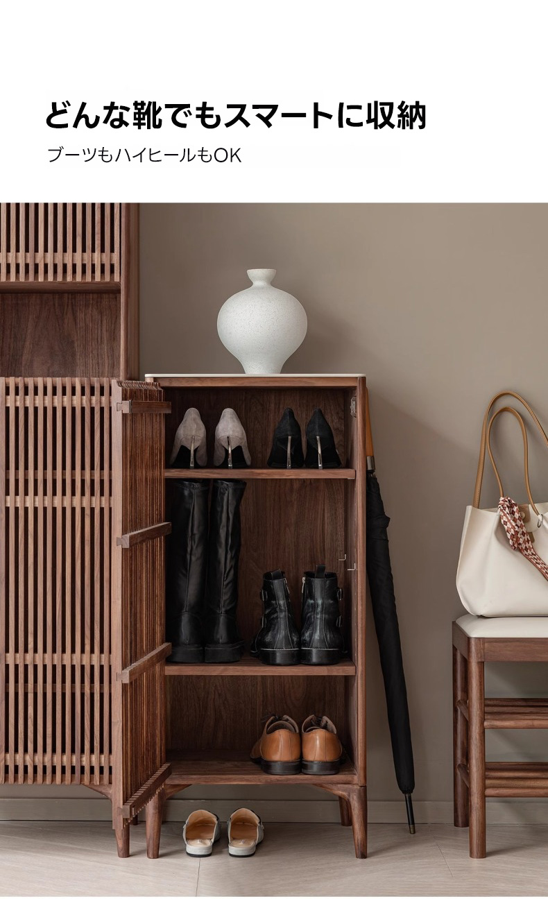 - 【高級感あふれるシューズラック】ウォールナット材を使用した高級感あふれるシューズラックで、玄関をスタイリッシュに演出します。耐久性と美しい木目を実現し、どんなインテリアにもマッチします。