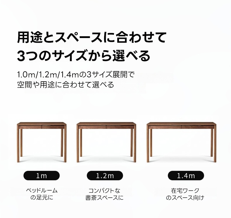 - 【多様な用途に対応】3つのサイズ(100cm、120cm、140cm)から選べるため、ベッドルーム、書斎、ホームオフィスなど、様々なシーンで活躍します。高さ75cmで足元にゆったりとしたスペースを確保し、快適な作業環境を提供します。