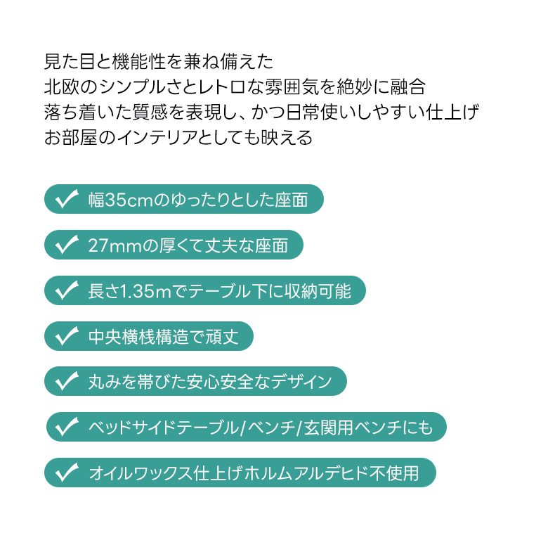 - 【安心の素材と仕上げ】ホルムアルデヒドを使用していないため、環境にも優しく、妊婦や乳児にも安心して使用できます。幅35cm、長さ135cm、高さ44cmのサイズで、3人まで座れる設計です。