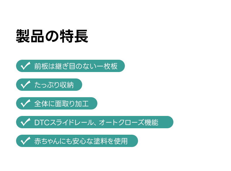 - 【安全で安心なデザイン】全体に面取り加工が施され、角が丸く仕上げられているため、家族にも安全なデザインです。赤ちゃんにも安心な塗料を使用しており、国際基準を上回る安全性を誇ります。