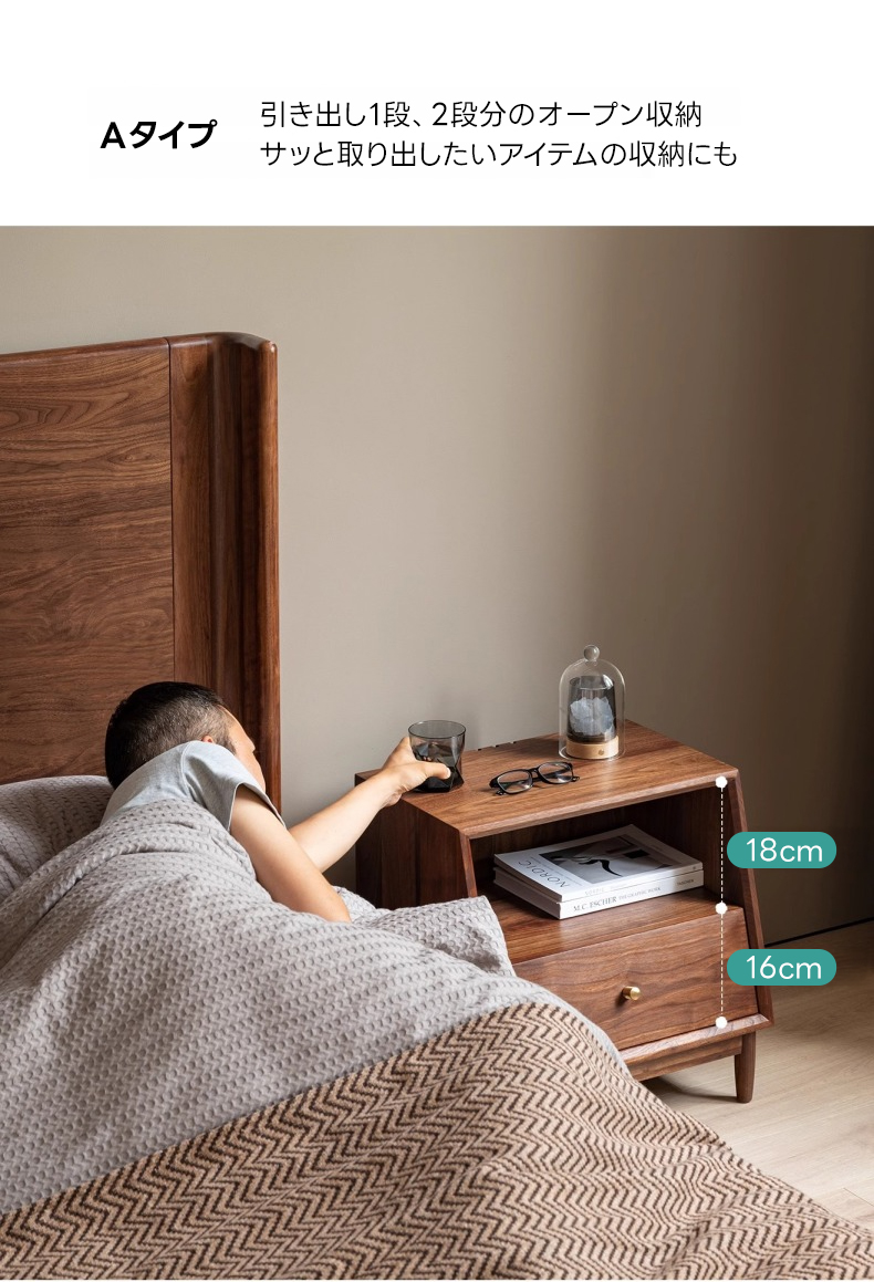 - 【多機能収納】2種類の収納スペースを備え、オープン収納と引き出しを使い分けることができます。Aタイプは1段の引き出しと2段のオープン収納、Bタイプは3段の引き出しで異なる深さが便利です。ベッドサイドの小物整理に最適です。