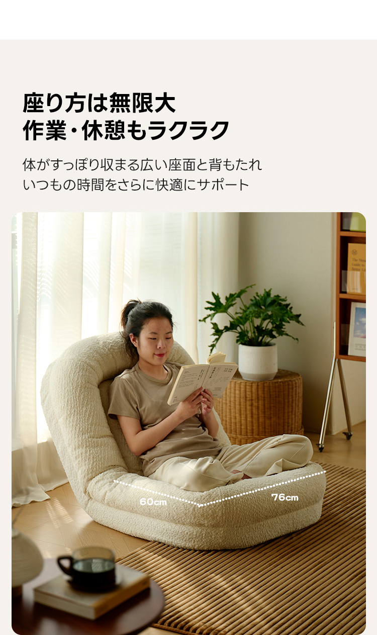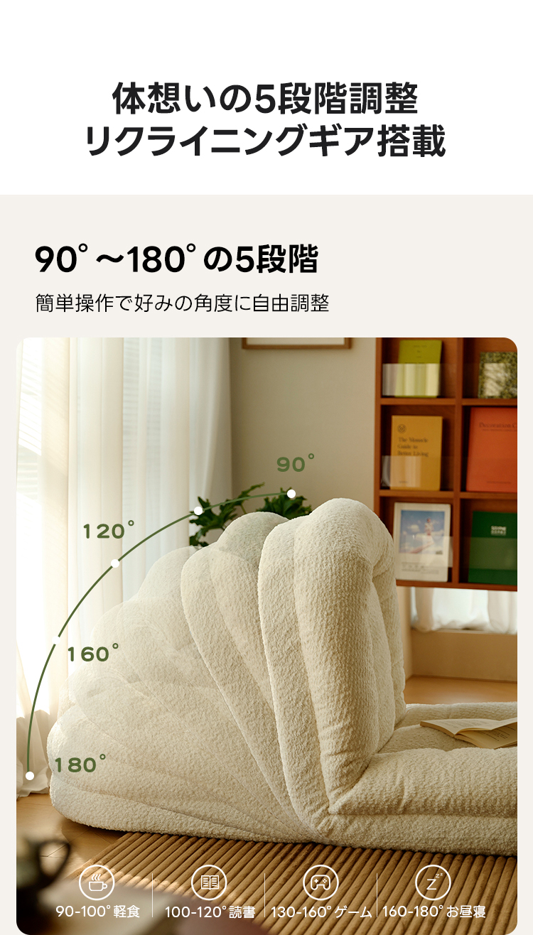 - 【多機能リクライニング機能】ナチュラルフロアチェアは90°から180°までの5段階リクライニングが可能で、読書やゲーム、昼寝など多様なシーンで快適に過ごせます。どんな姿勢でもしっかりサポートし、長時間の使用でも疲れにくい設計です。