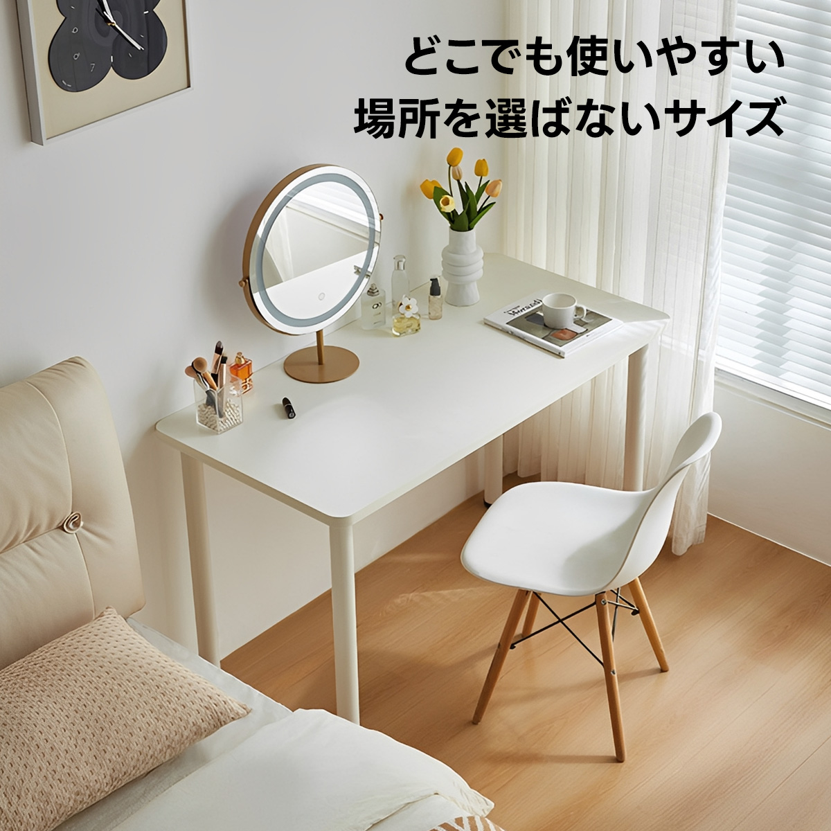 - 【多用途な使用と適用場面】:このデスクは、ワークデスクとしてだけでなく、ドレッサーやダイニングテーブルとしても活用できます。コンパクトなデザインが特徴で、オフィスや自宅の限られたスペースを有効活用できます。