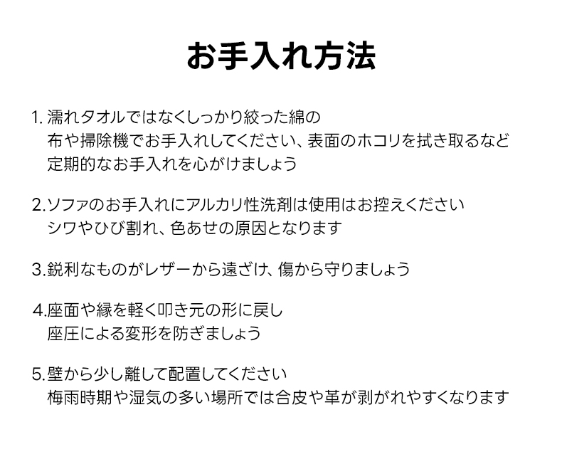 - 【安心のサポートとケア】定期的に乾いた布で表面のホコリを拭き取り、アルカリ性洗剤の使用は避けてください。鋭利なものから遠ざけ、傷から守るようにしましょう。座面や縁を軽く叩いて形を整え、座圧による変形を防ぎます。