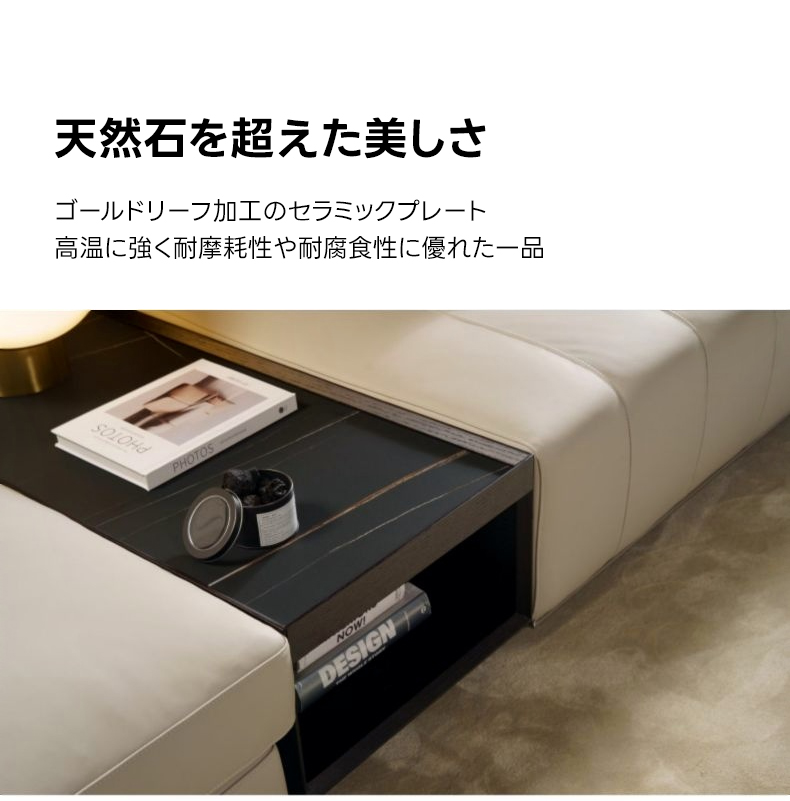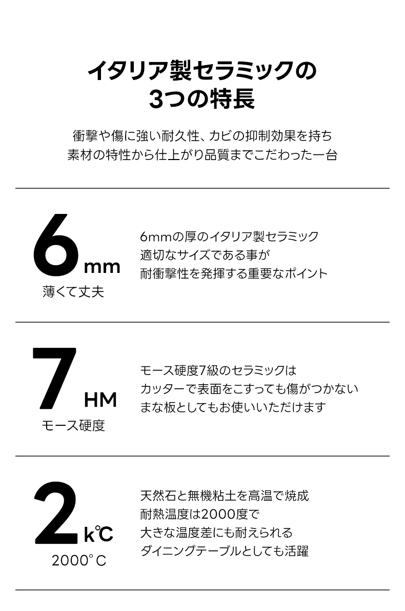 - 【高級感と耐久性】セラミック天板キャビネットは、イタリア製の高品質セラミックを使用し、耐衝撃性や耐摩耗性に優れています。モース硬度7級の強度を持ち、カッターでこすっても傷がつきにくい設計です。耐熱温度は2000℃に達し、ダイニングテーブルとしても安心してご使用いただけます。