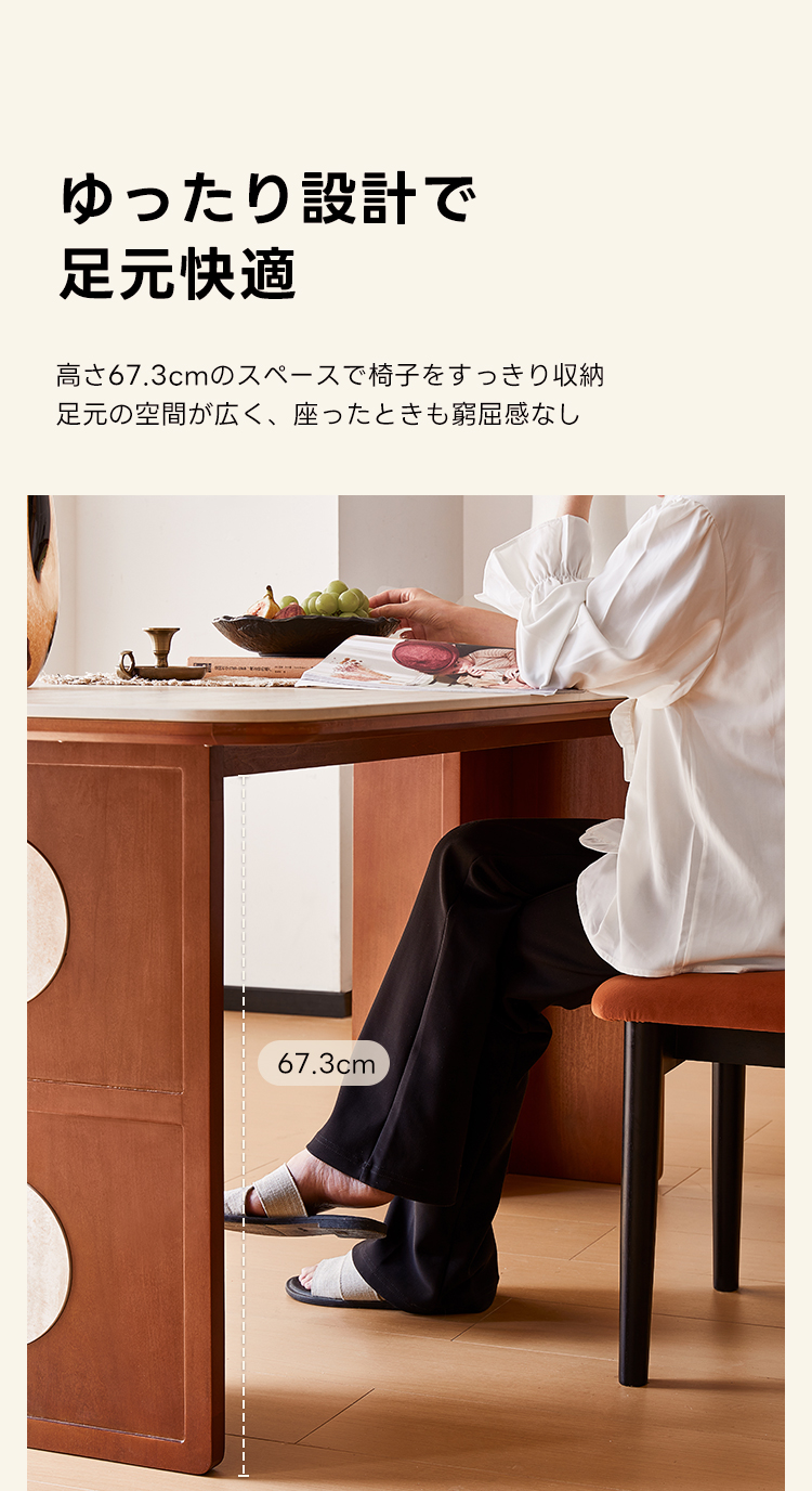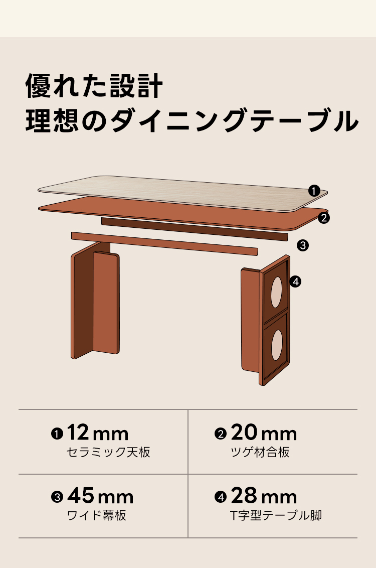 - 【快適なダイニング体験】:幅広の天板と安定感のあるT字型テーブル脚により、家族や友人との食事を快適に楽しめます。開放感のあるデザインで、どんなダイニング空間にもマッチします。