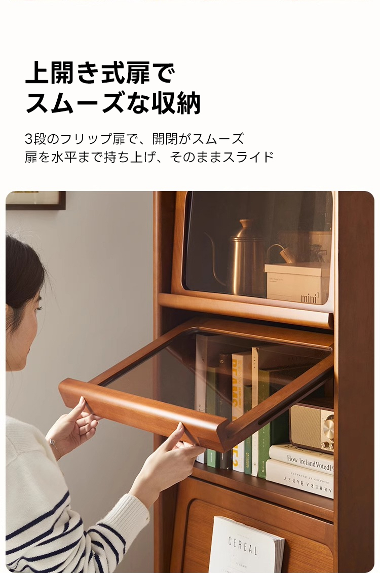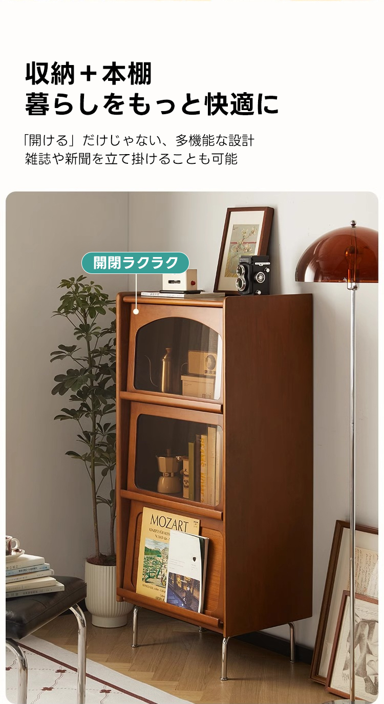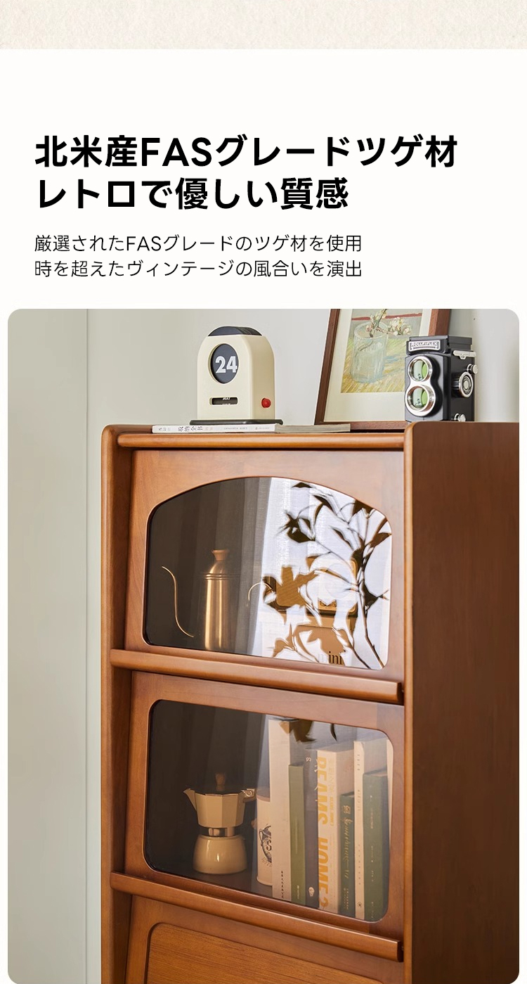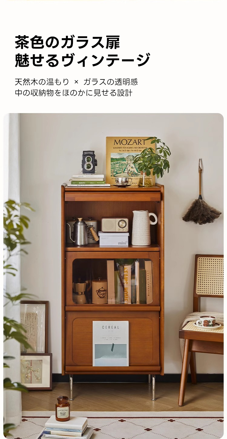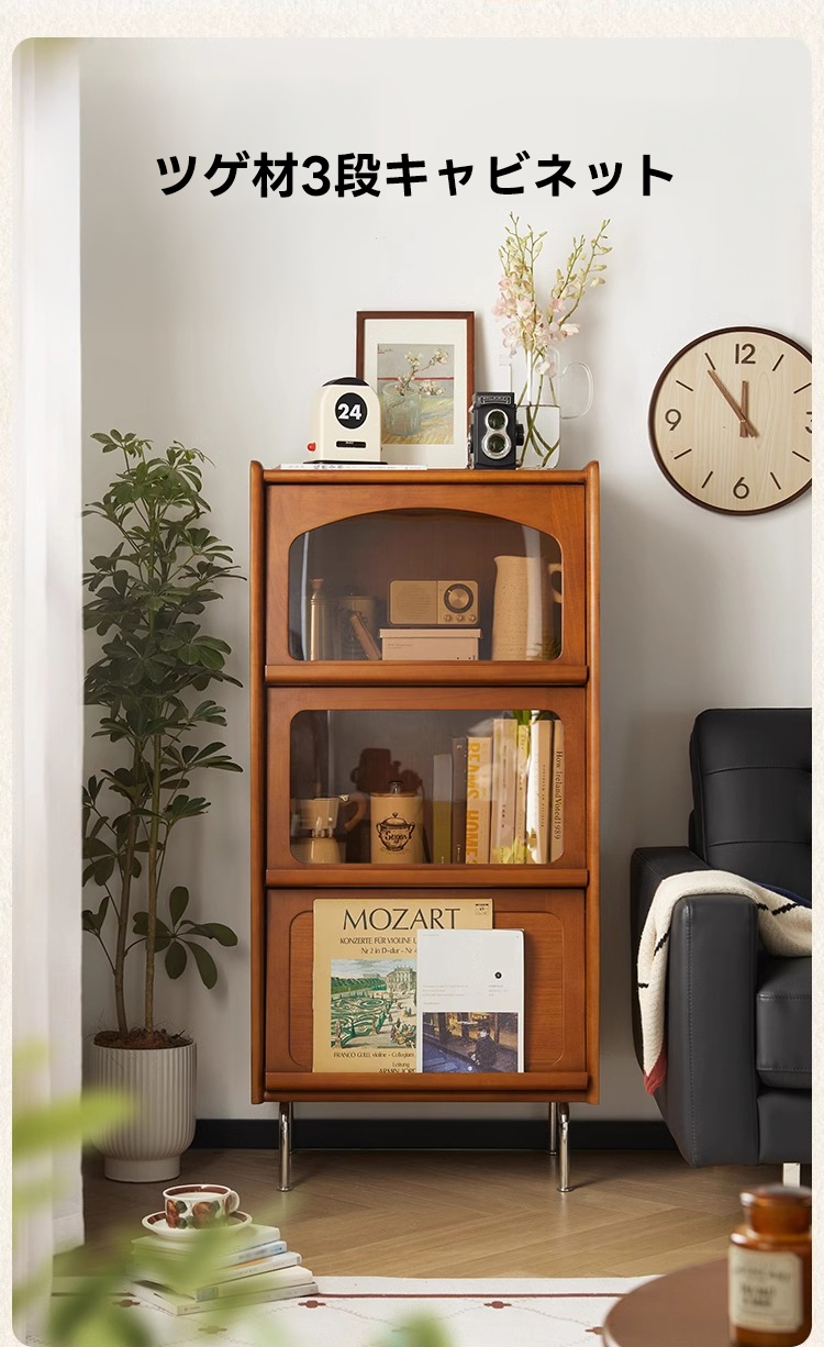 - 【高級感と機能性の両立】:ツゲ材を使用した3段キャビネットは、ヴィンテージな雰囲気と高級感を兼ね備えています。ブラウンの色合いと美しい木目がリビングルームを落ち着いた空間に変えます。茶色のガラス扉は中の収納物を優雅に見せ、インテリアとしても魅力的です。