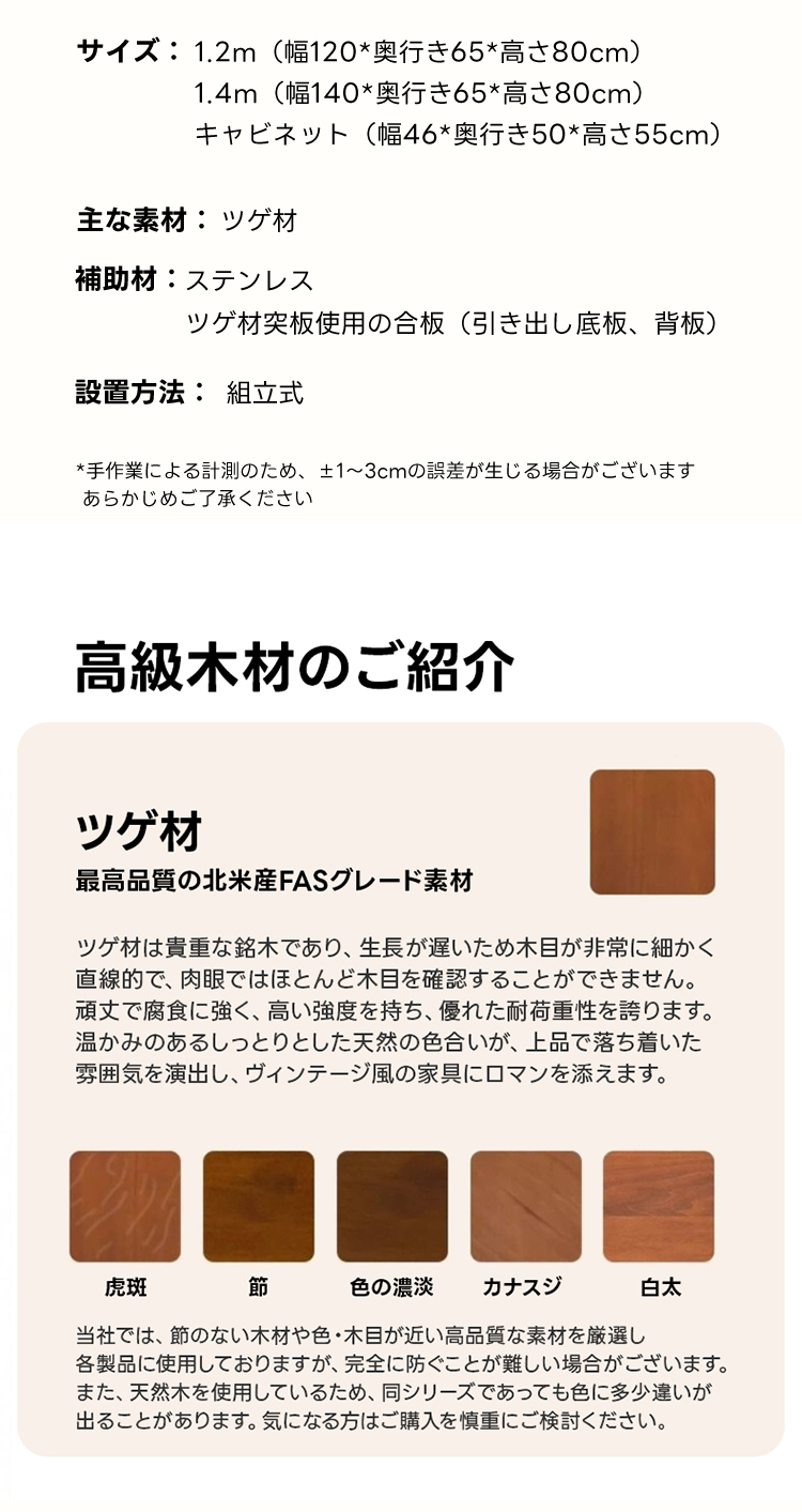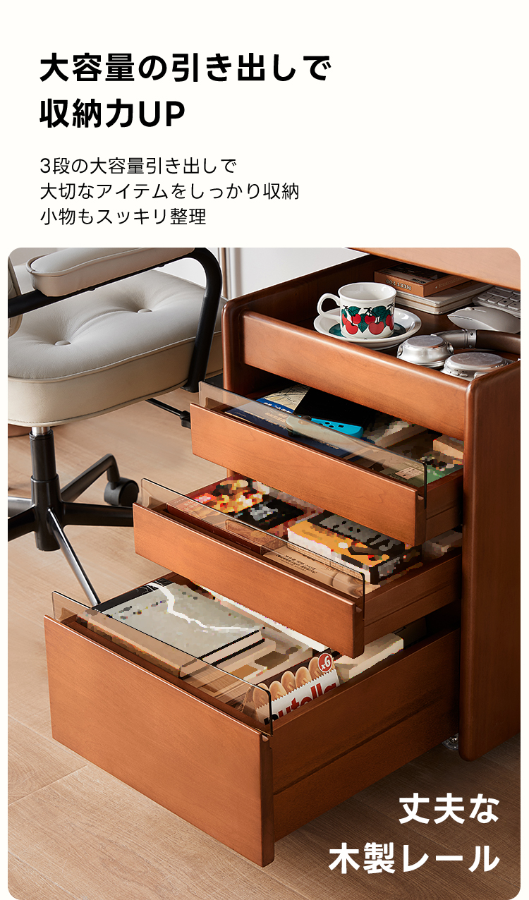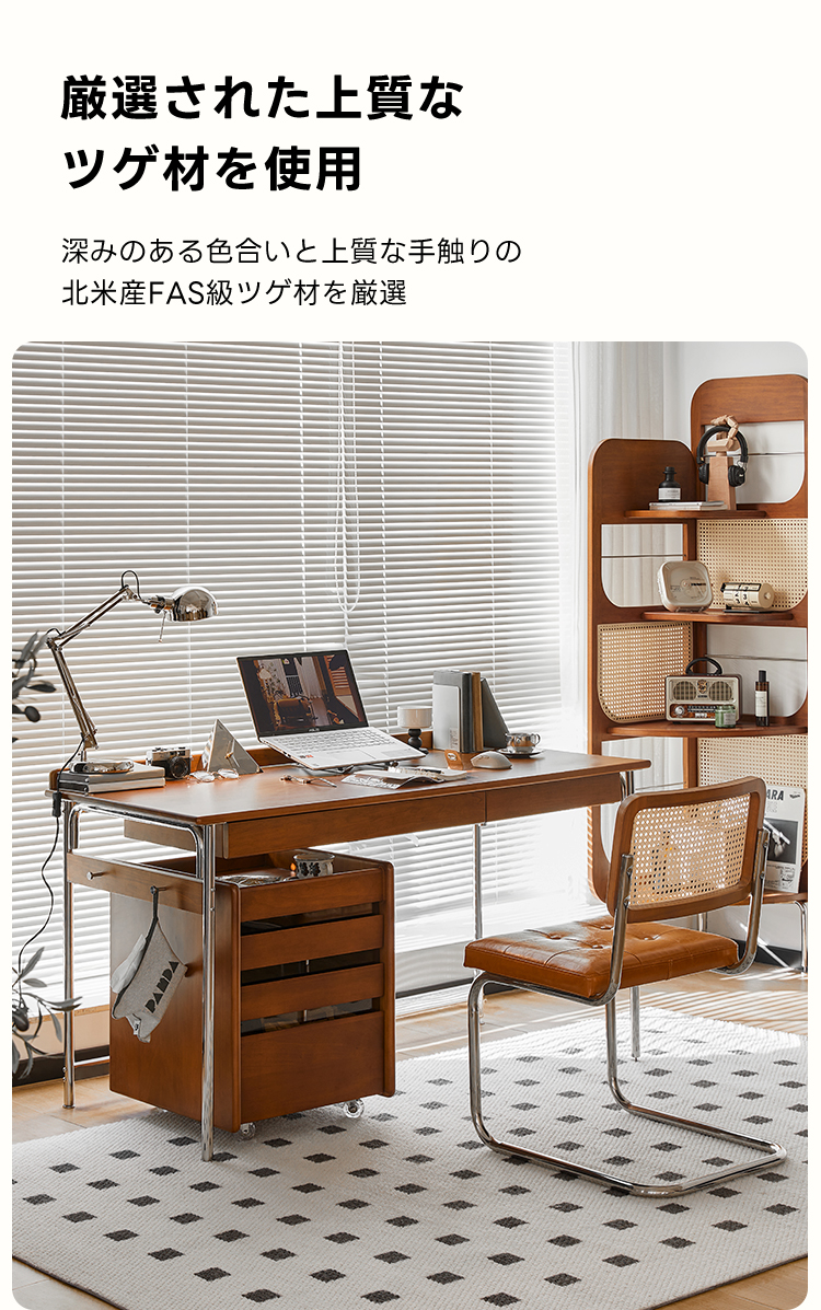 - 【高品質な素材とデザイン】北米産FASグレードのツゲ材を使用し、緻密な木目が美しい仕上がりを実現。金属製レールを使用した引き出しはスムーズな開閉が可能です。
