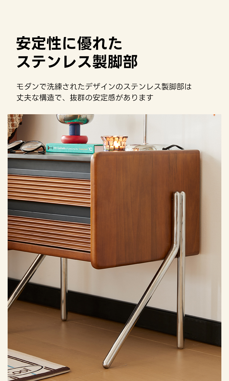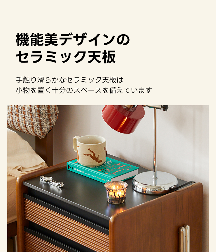 - 【優れた機能性とデザイン性】ツゲ材を使用したこのサイドチェストは、シンプルでありながら機能性に優れたベッドサイドキャビネットです。セラミック製の天板は撥水性、耐熱性、耐擦傷性に優れ、日常使いに最適です。ステンレス製の脚部はモダンで洗練されたデザインで、安定感が抜群です。