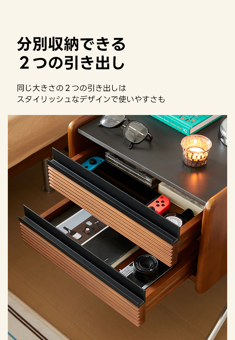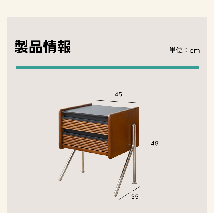- 【多様な適用シーン】幅45cm、奥行き35cm、高さ48cmのコンパクトなサイズは、一人暮らしやカップル、ファミリー向けに最適で、寝室やベッドルームにぴったりです。2つの引き出しは同じサイズで、スタイリッシュなデザインが施されており、分別収納が可能です。