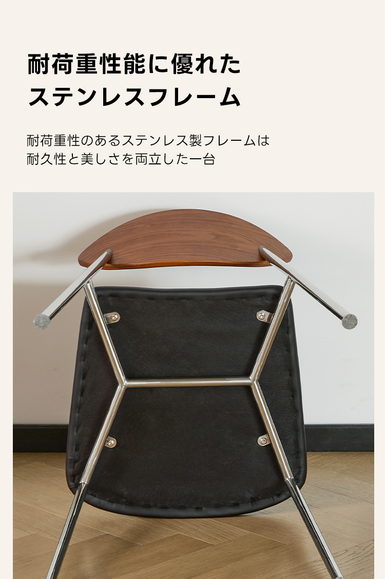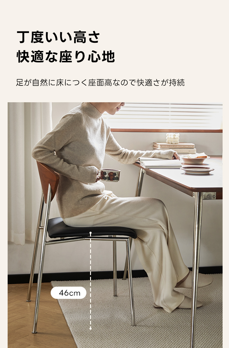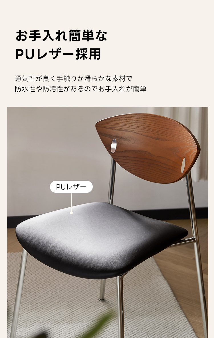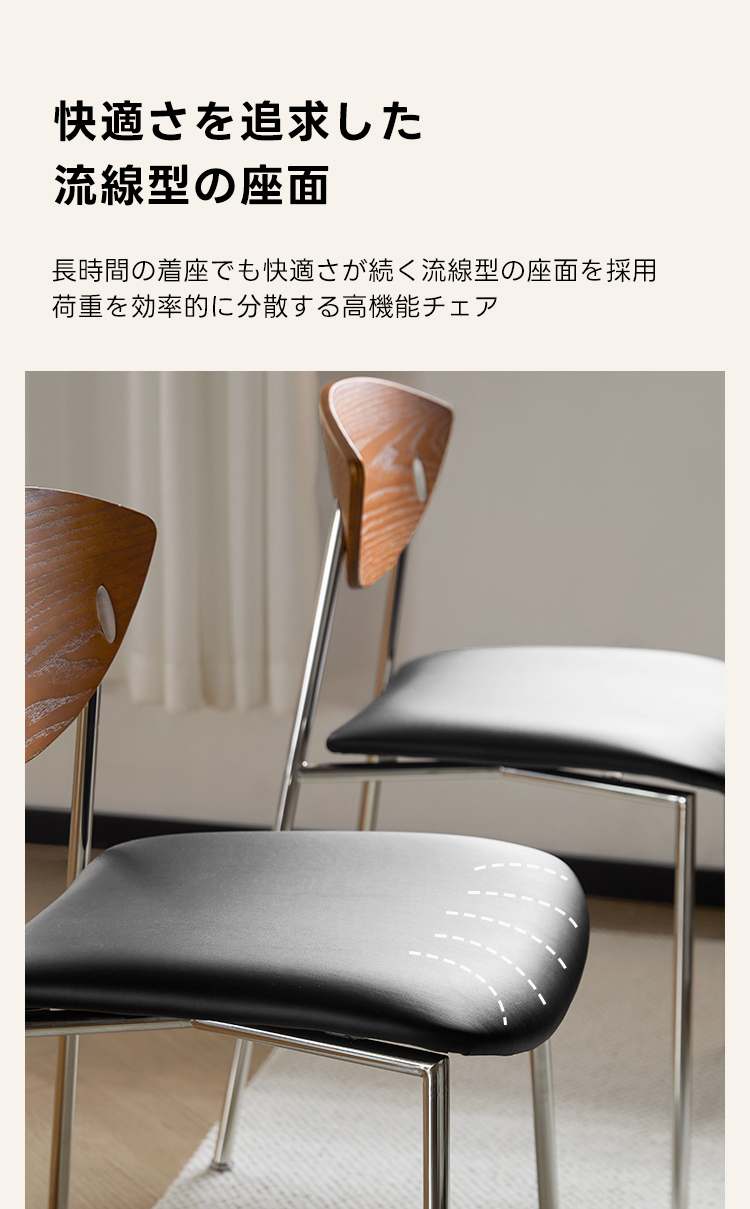 - 【高品質な素材とデザイン】:ナチュラルな木目が美しいタモ材を使用し、座面は通気性、防水性、防汚性に優れたPUレザーで覆われています。ステンレス製のフレームは耐久性が高く、150kg以上の耐荷重を誇ります。