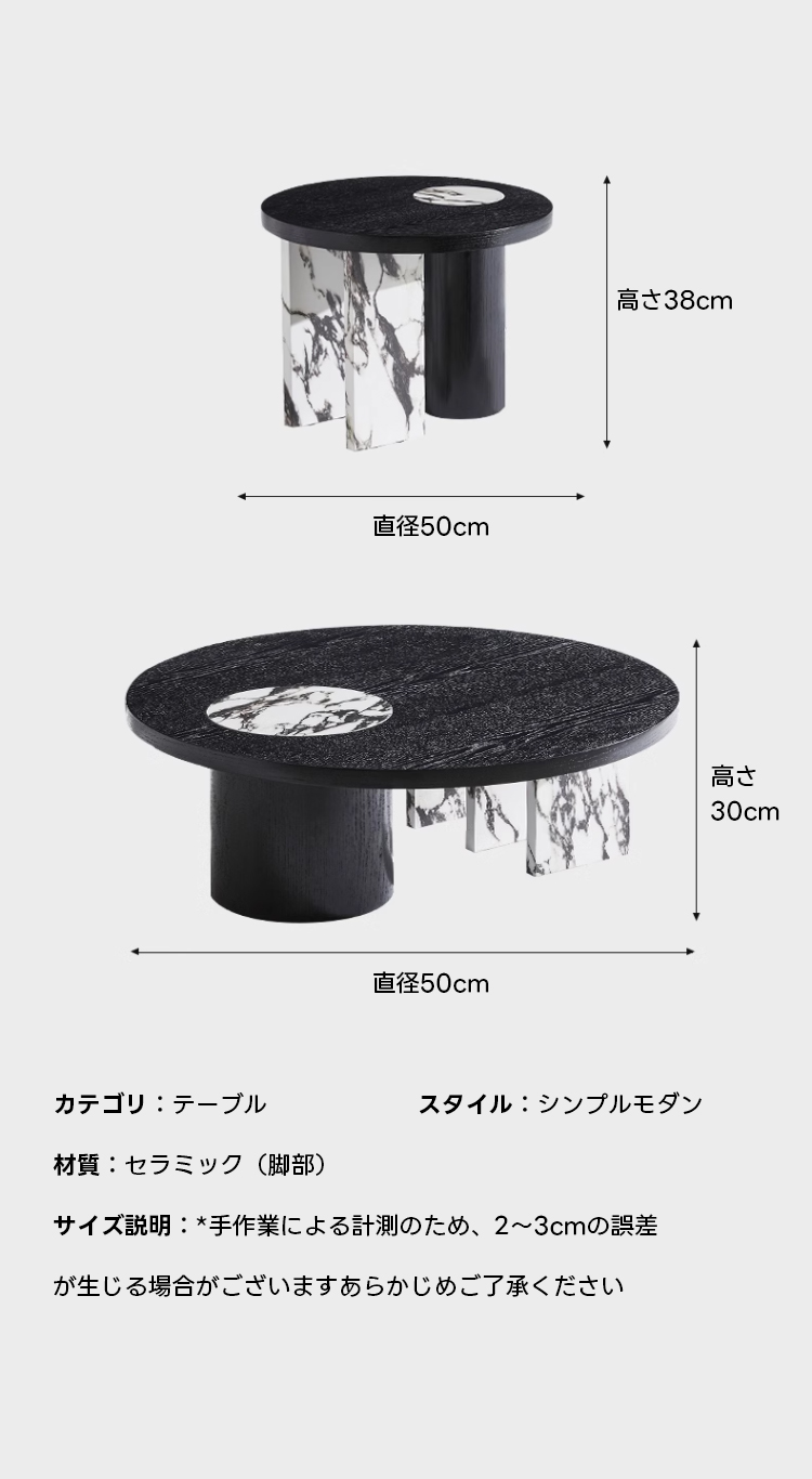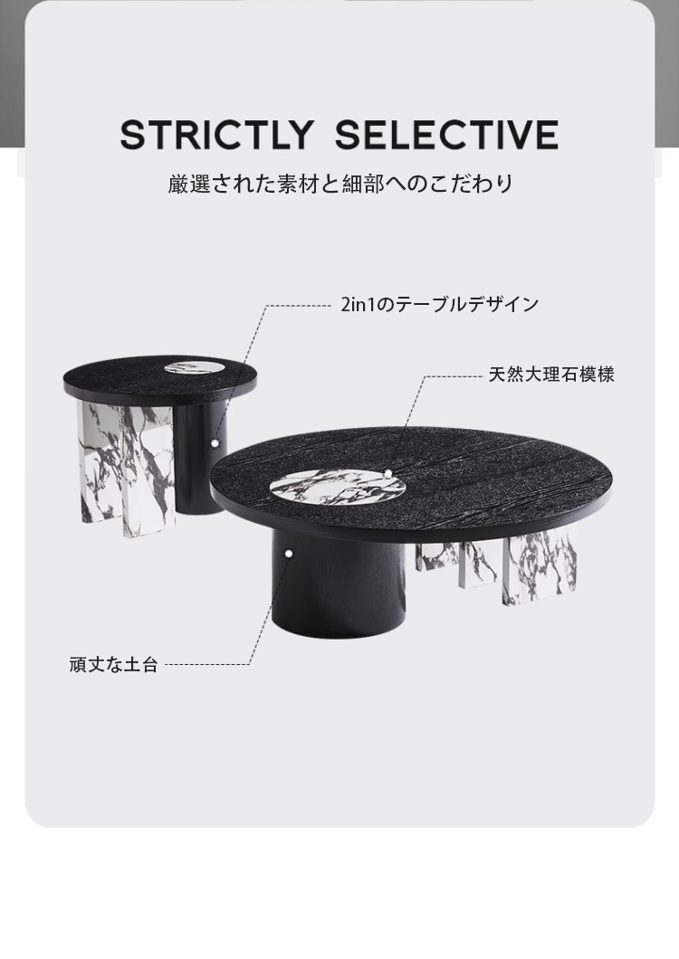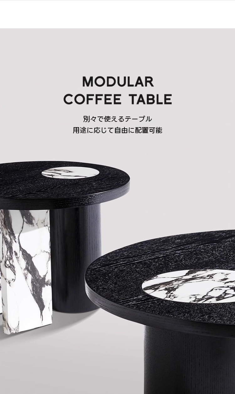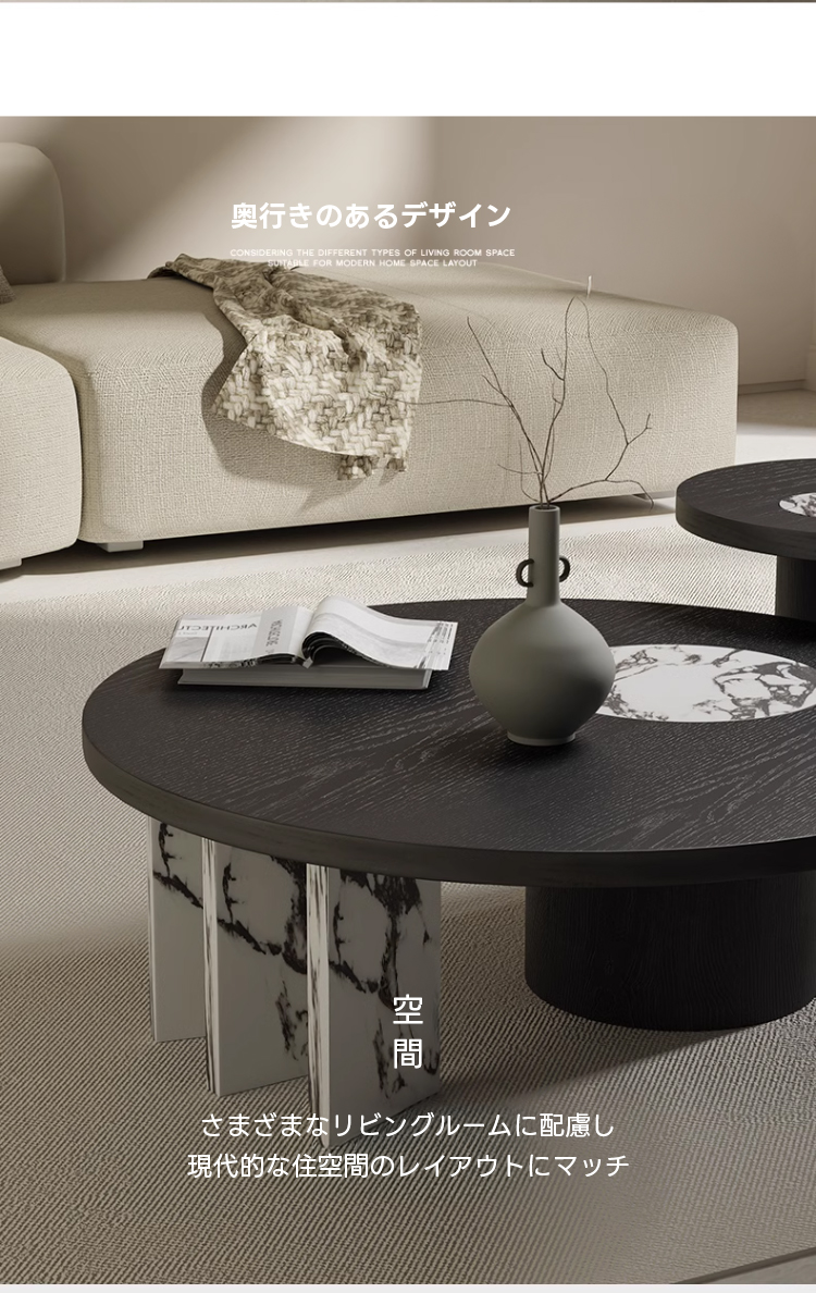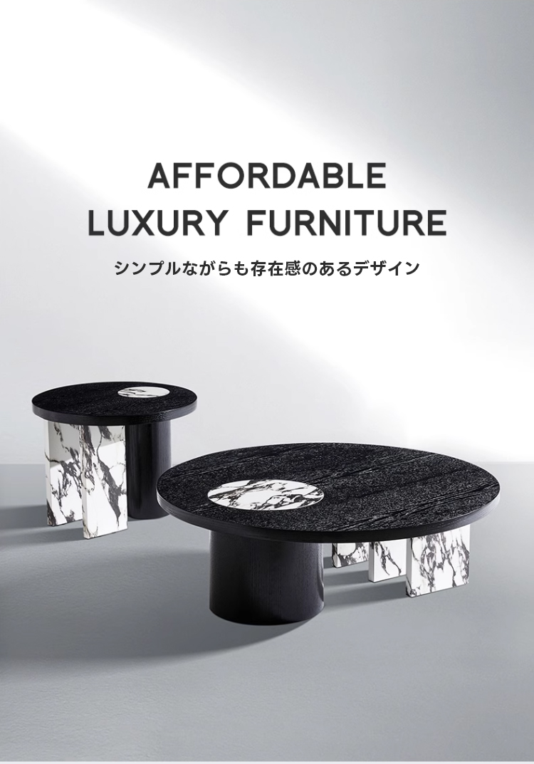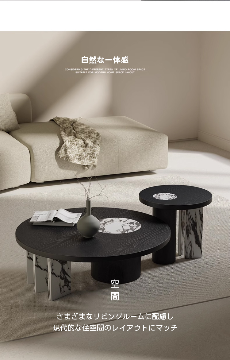 - 【多機能性とデザインの融合】:異素材ラウンドコーヒーテーブルは、シンプルモダンなデザインと多機能性を兼ね備えています。ブラックを基調としたシックなデザインに、天然大理石模様がアクセントを加え、どんなインテリアにも自然に溶け込みます。ネストテーブルとして2in1の機能を持ち、スペースに応じて自由に配置できるため、リビングや座卓として幅広く活用できます。