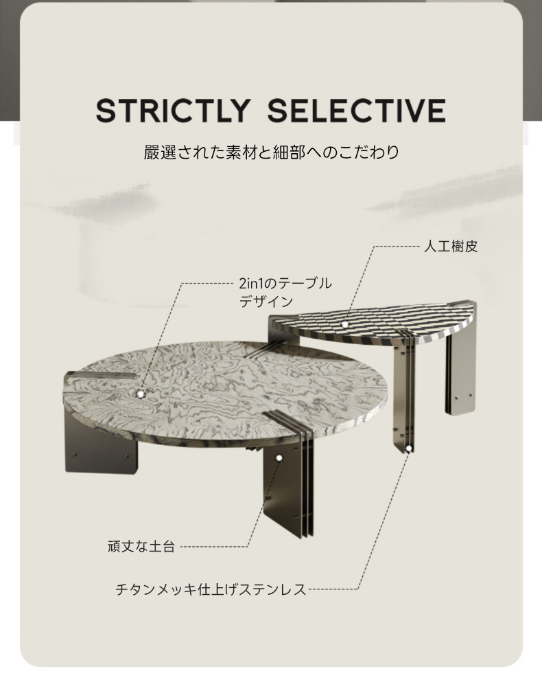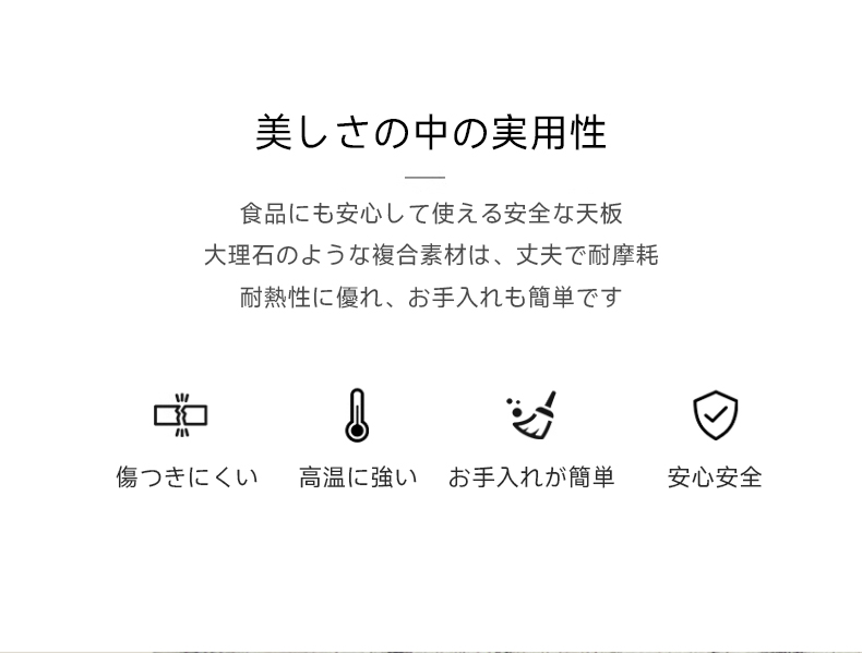 - 【高品質な素材と堅牢な構造】:天板は人工樹皮で作られており、安全性を備えています。大理石のような複合素材は丈夫で耐摩耗性に優れ、耐熱性も高いです。チタンメッキ仕上げのステンレス脚部が卓越した耐久性と安定性を提供します。