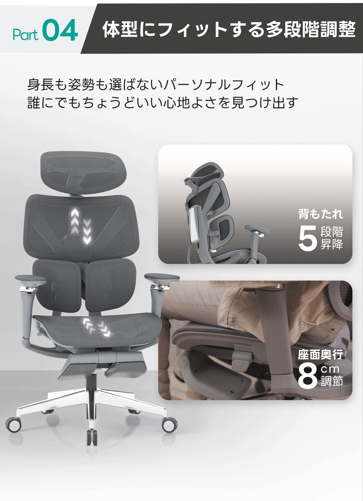 - 【多方向調整で体型にフィット】4方向に調整可能なヘッドレスト、3D可動のアームレスト、130°のリクライニング機能などを備え、体型や用途に合わせて最適なポジションに調整できます。