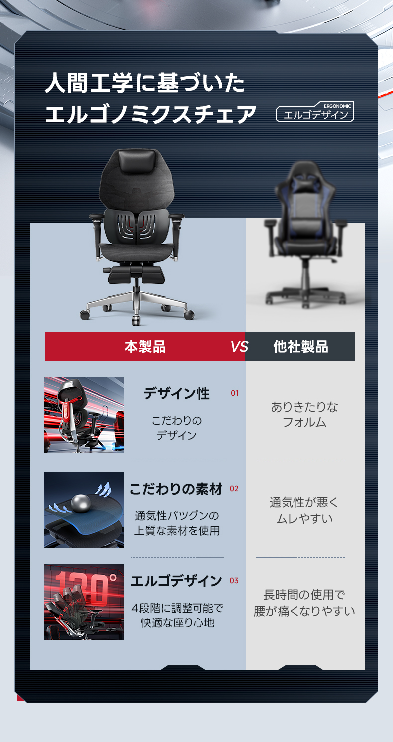 - 【エルゴノミクスデザインで快適サポート】:人間工学に基づいた設計で、長時間の使用でも腰や背中に負担をかけません。4段階のリクライニング機能により、オフィスワークからリラックスタイムまで幅広く対応します。