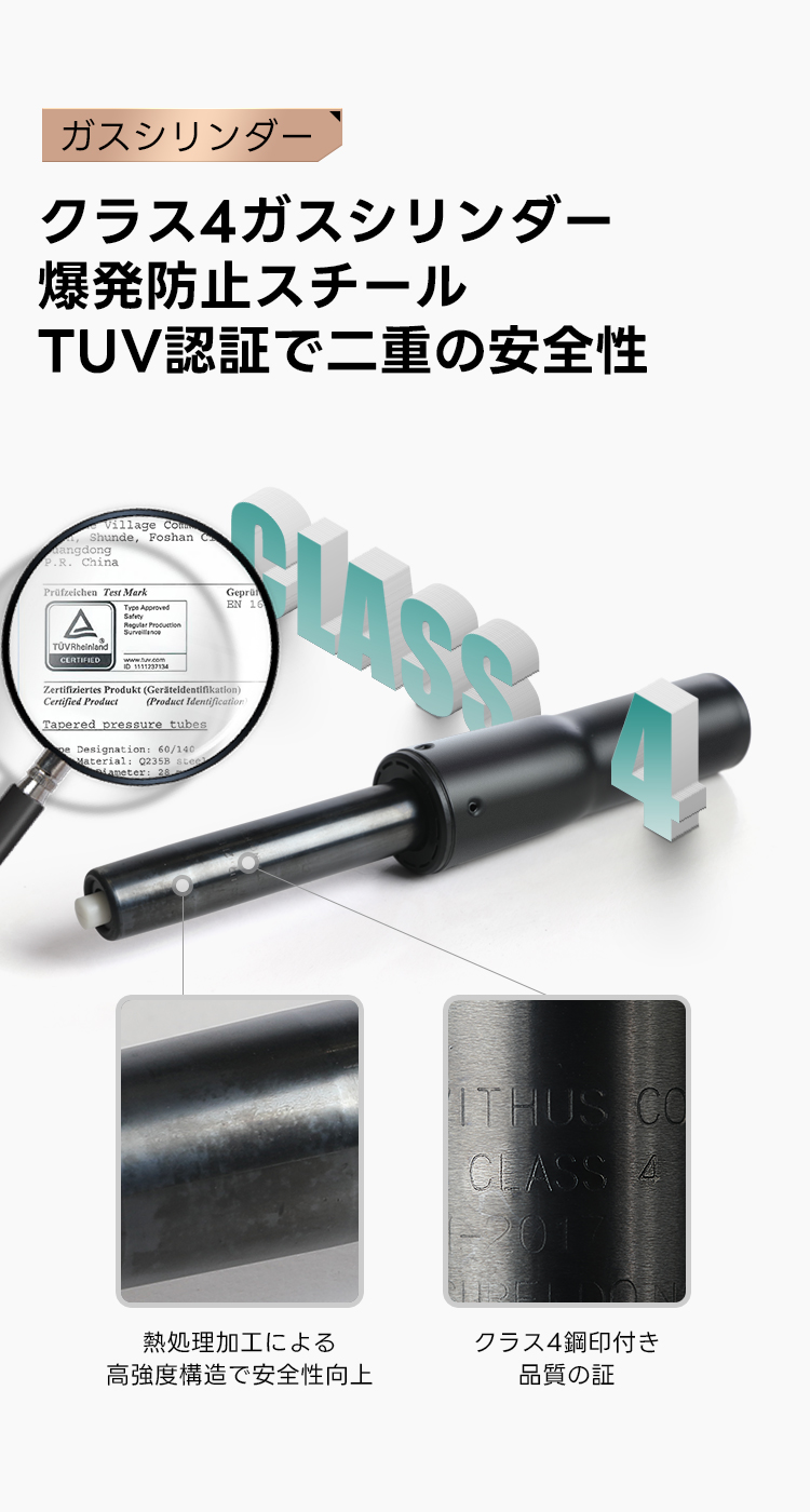 - 【安心の安全性と耐久性】:クラス4ガスシリンダーで、TUV認証による二重の安全性を確保。アルミ合金ベースと高品質キャスターで、耐摩耗性と静音性を兼ね備えています。