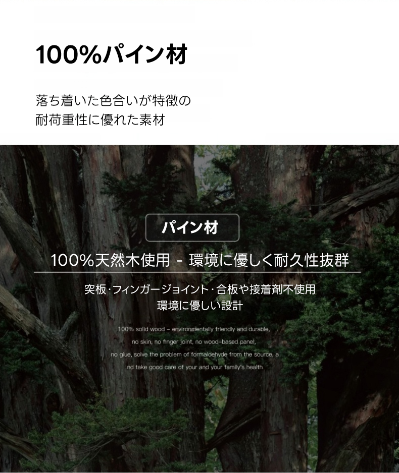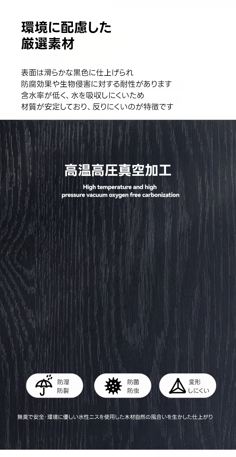 - 【高品質な素材と仕上げ】:100%パイン材を使用し、フィンガージョイントや接着剤を使わない環境に優しい設計。高温高圧真空酸素フリー炭化処理により、防湿、防菌、防虫効果もあります。