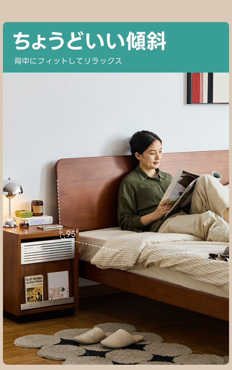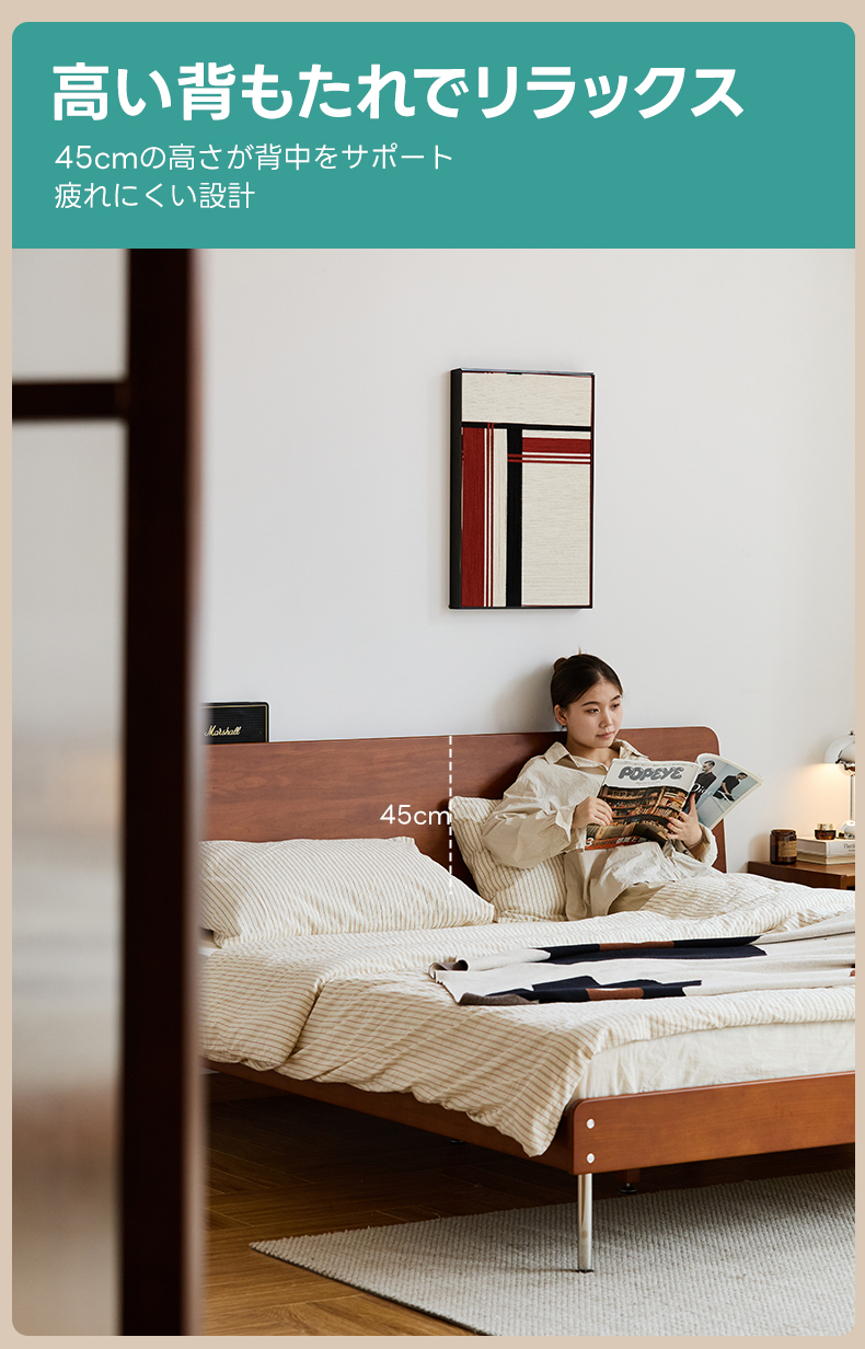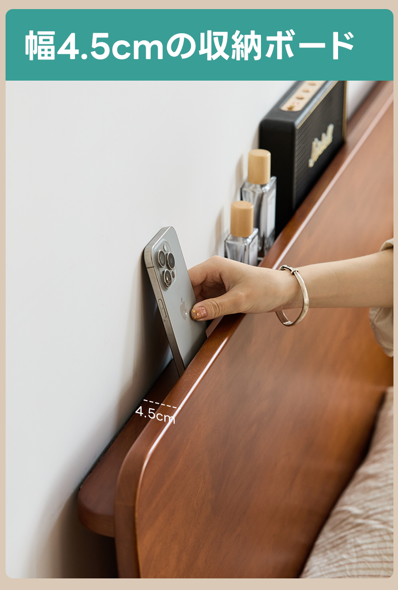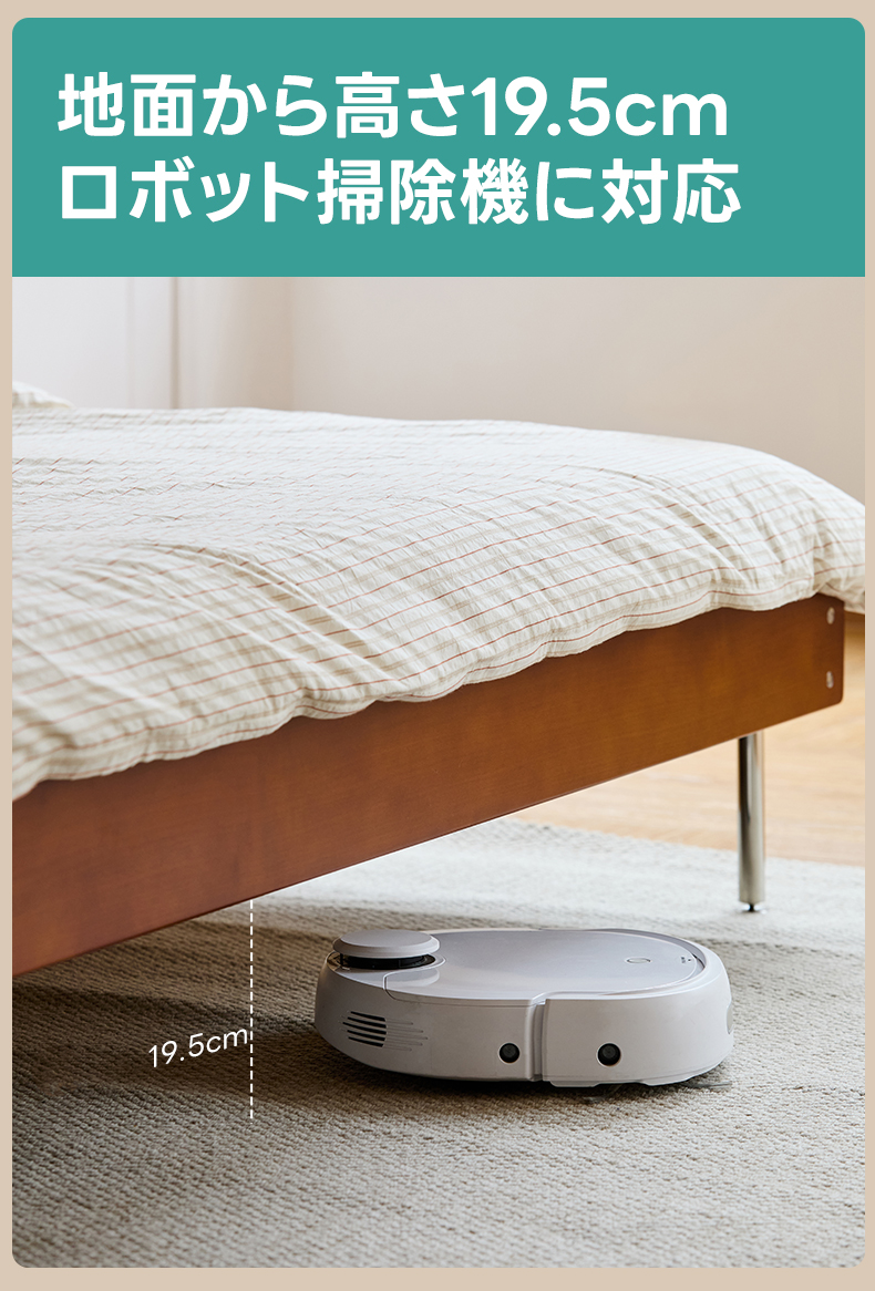 - 【快適なデザインと機能】45cmの高さのヘッドボードが背中をサポートし、リラックスした姿勢を保てます。ベッド下の高さは19.5cmあり、ロボット掃除機にも対応可能です。幅4.5cmの収納ボードがあり、スマートフォンや小物を置くのに便利です。