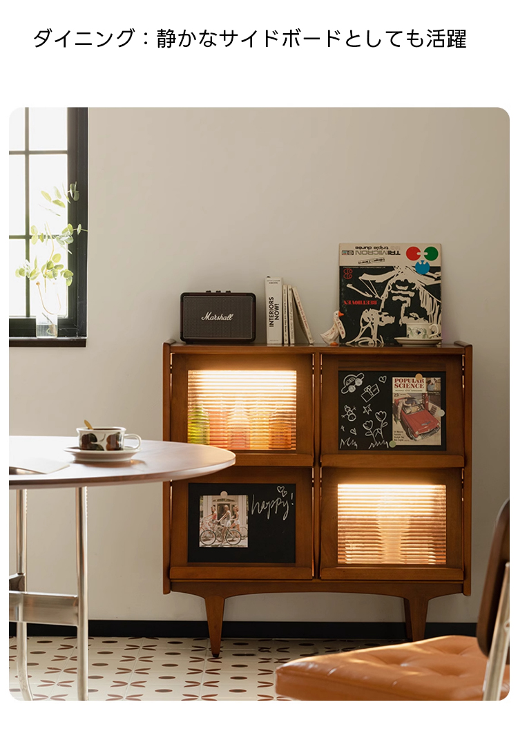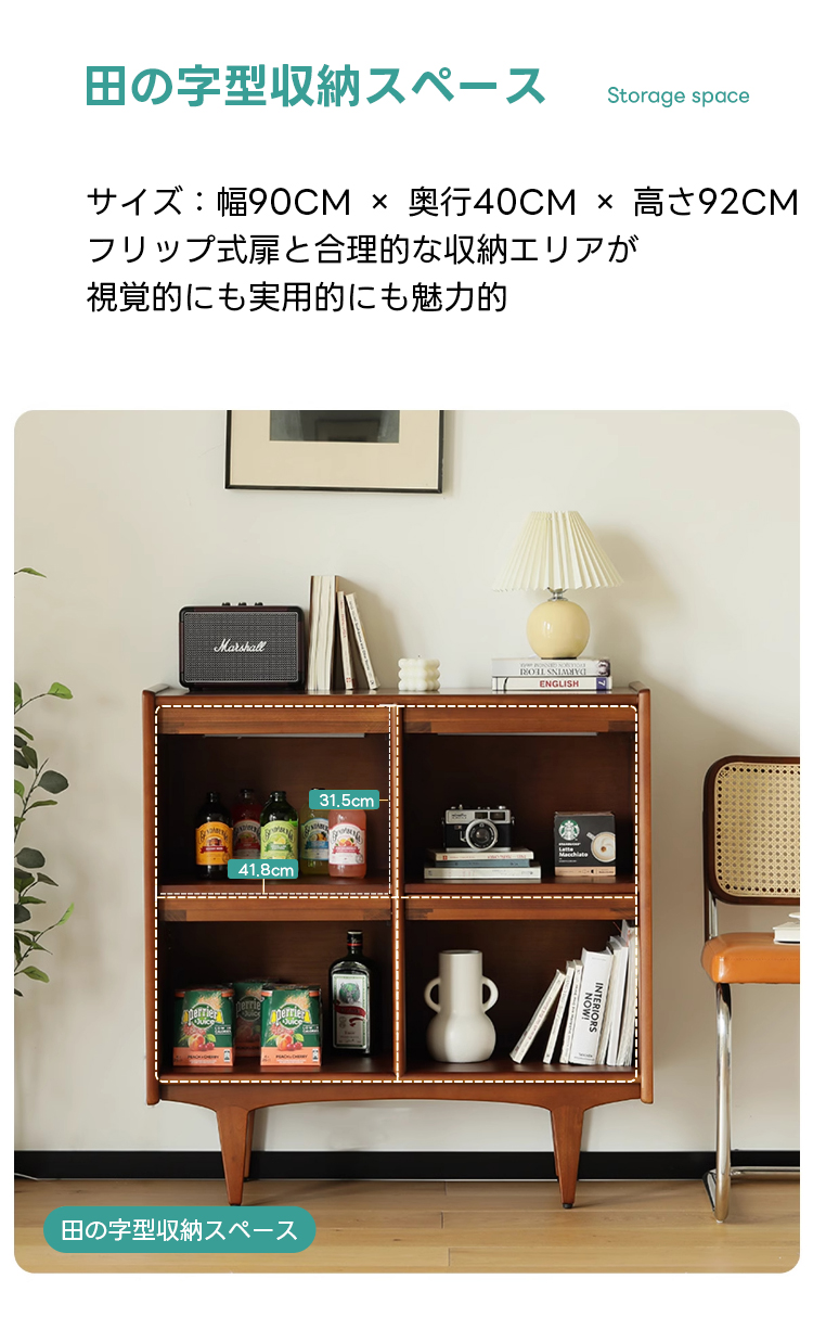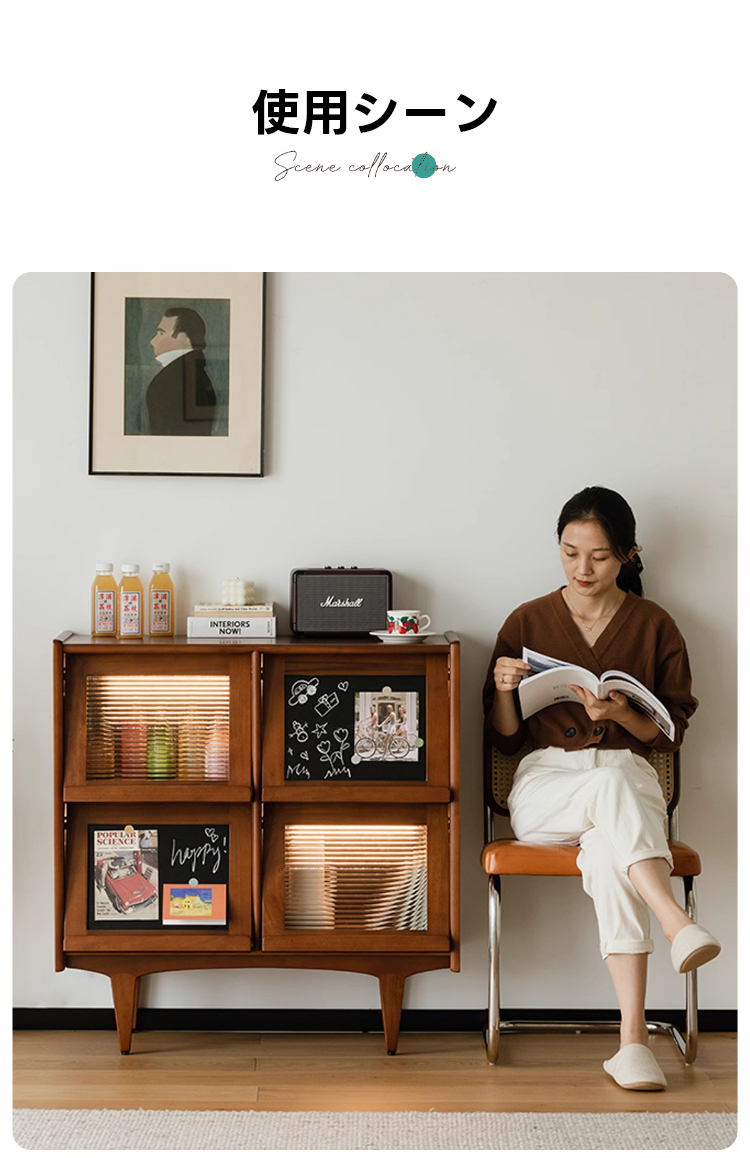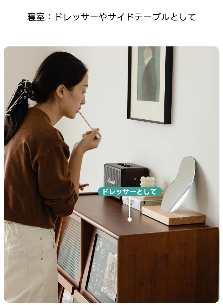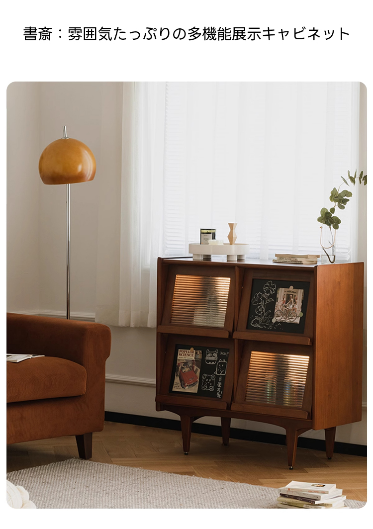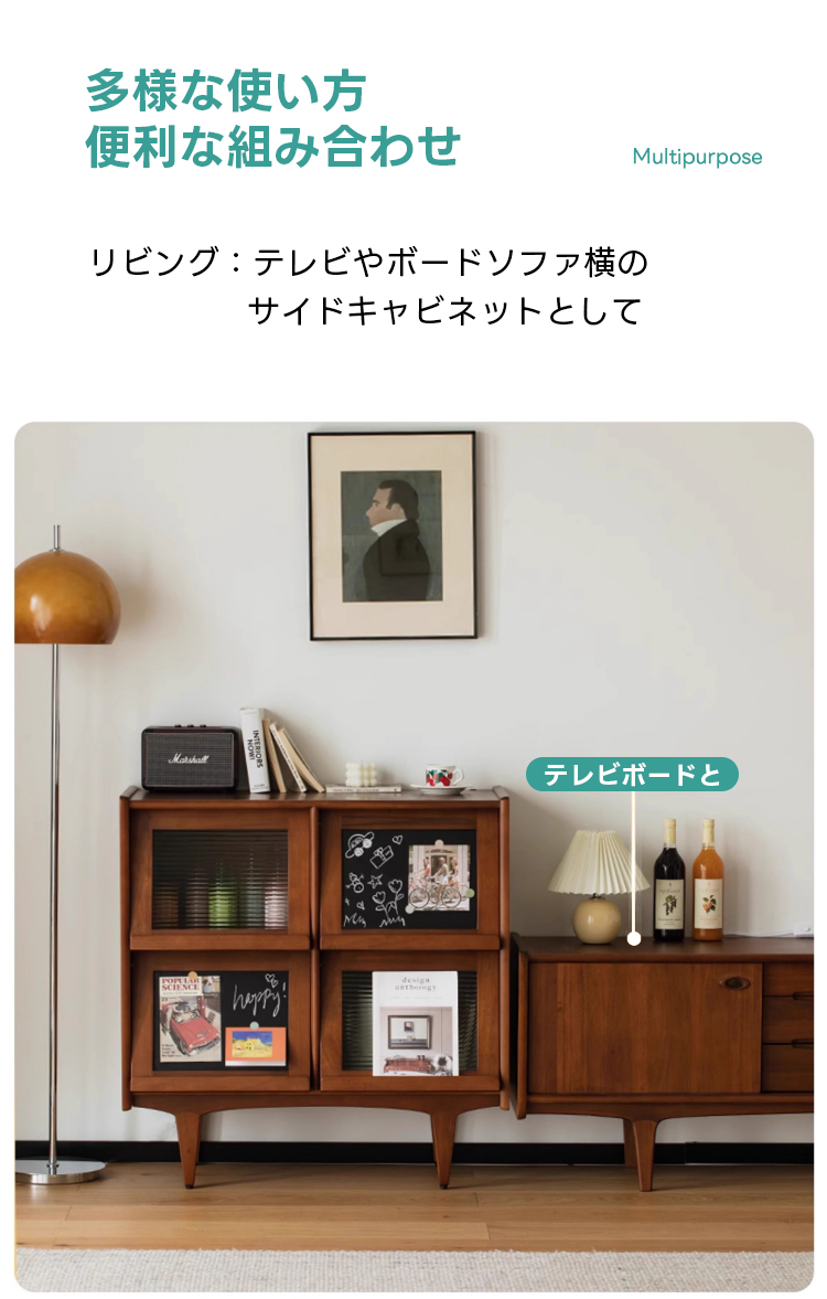 - 【多機能収納キャビネット】:このキャビネットは、ヴィンテージスタイルとナチュラルなデザインが魅力で、リビングや寝室、書斎、ダイニングなど、あらゆる場所で活躍します。テレビボードやサイドテーブルとしても利用可能で、収納力とデザイン性を兼ね備えた一品です。