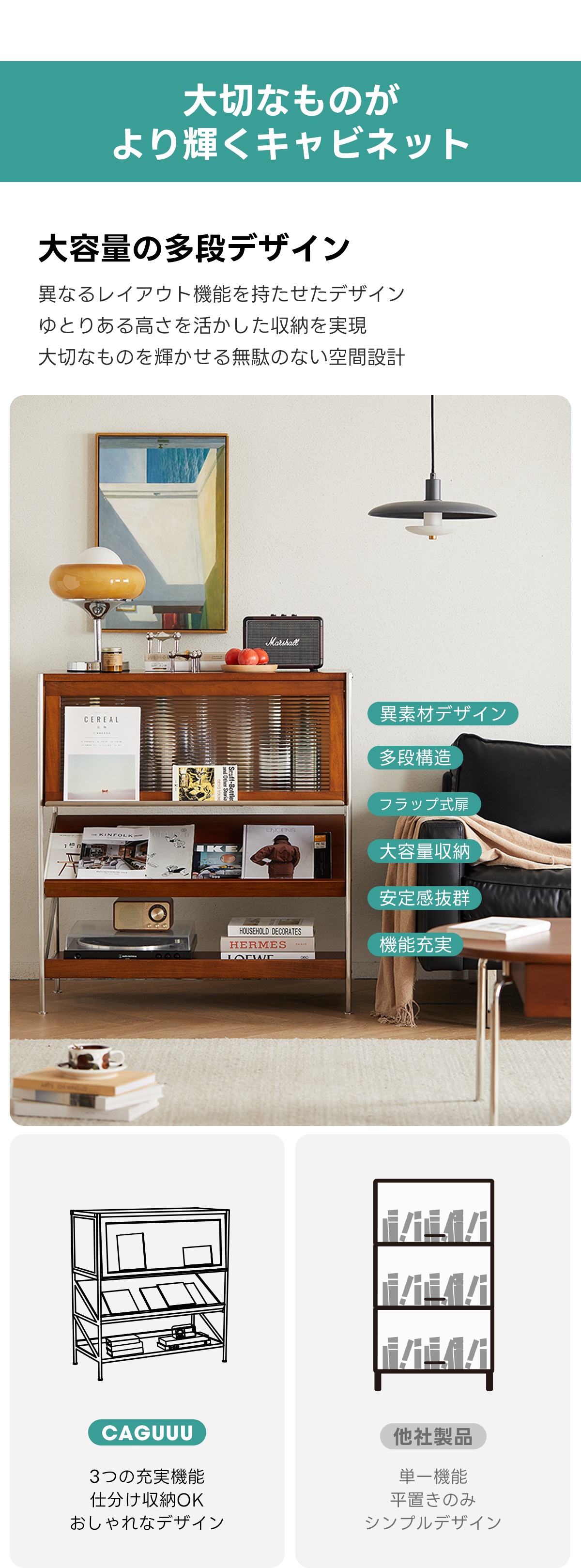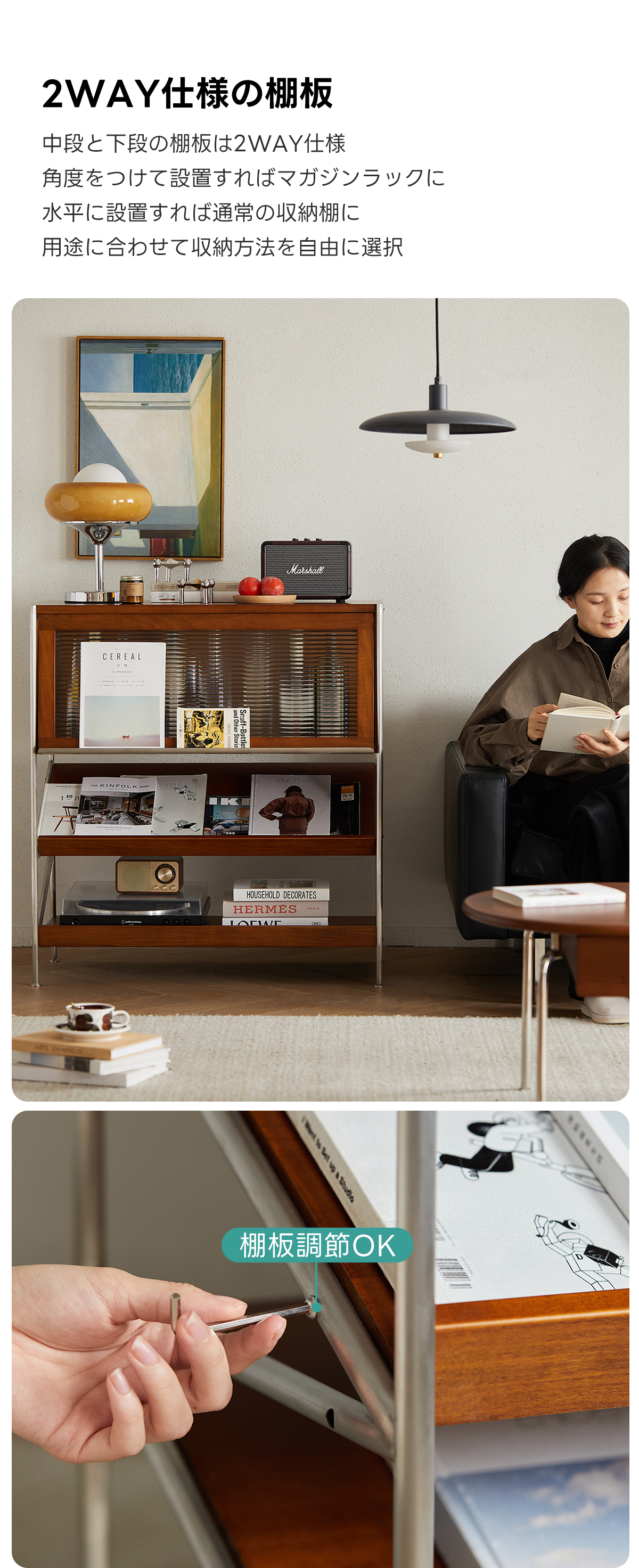 - 【優れた収納力】:幅40.8cm、耐荷重量200kg以上の頑丈な設計で、多くのアイテムを効率的に収納できます。2種類の使用方法があり、傾斜モードでは立体的に、水平モードでは通常の収納として使用可能です。リビングルームや寝室、さらにはレストランやサロンのサイドテーブルとしても最適です。