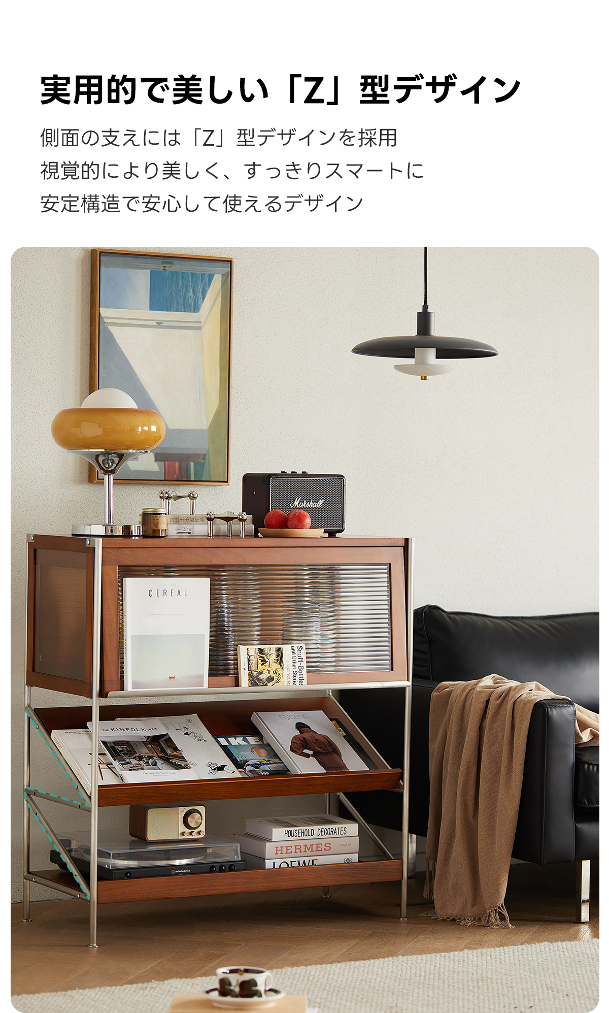 - 【高級感と安定感】:ステンレスの金属フレームと「Z」型デザインが、構造上の安定性を高めつつ、シンプルで美しいアクセントを加えています。ツゲ材のナチュラルな風合いがヴィンテージ感を引き立て、高級感を演出します。