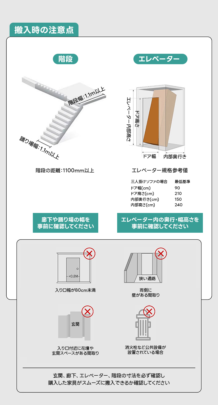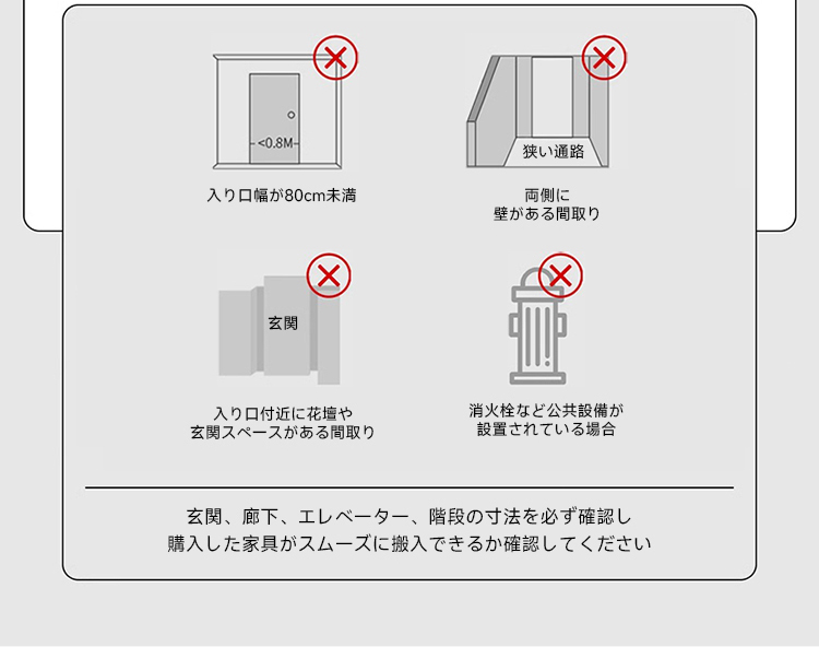 ※搬入不可等の理由による注文キャンセルは、ご返送にかかる費用をお客様にご請求いたします。ご注文前に大型家具の搬入方法をご確認ください。