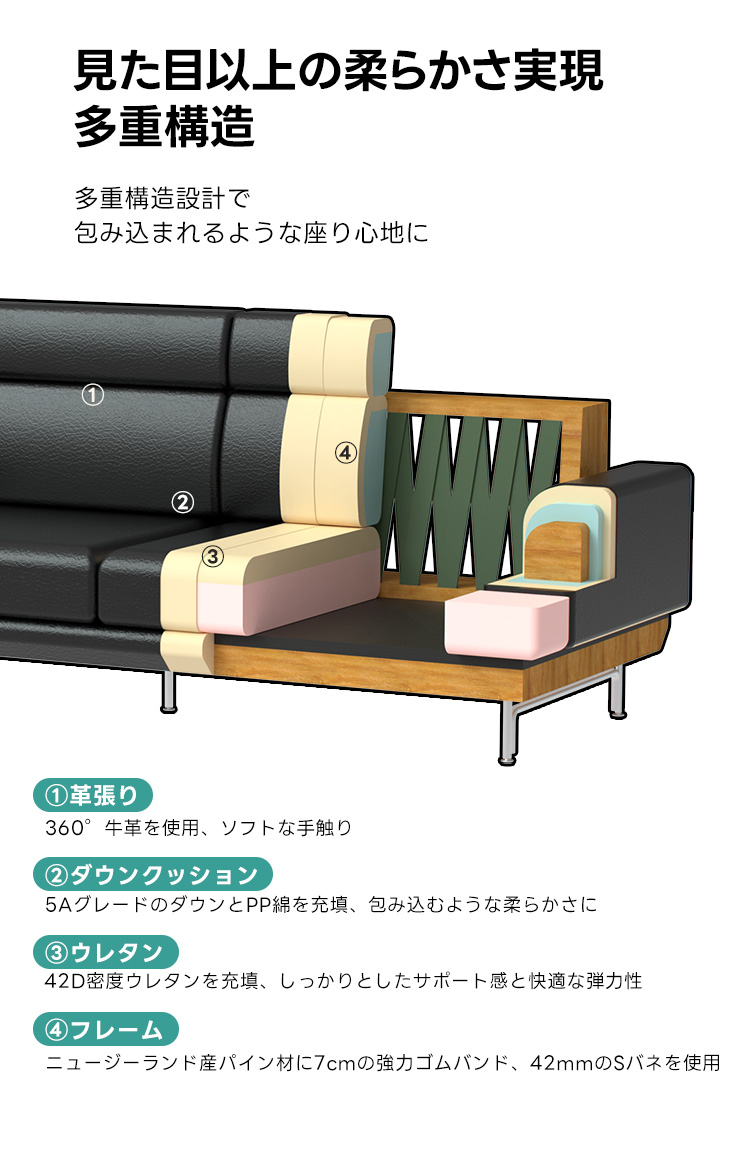 - 【安心のアフターサービス】:このソファは、耐久性と安全性を重視した設計で、長期間安心してご使用いただけます。厚さ4.2mmのスプリングが安定したサポートを提供し、快適な使用体験をお約束します。