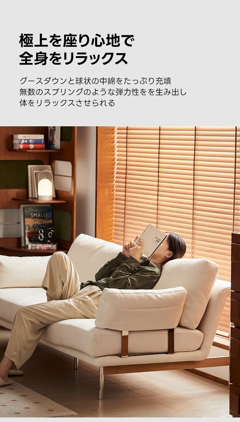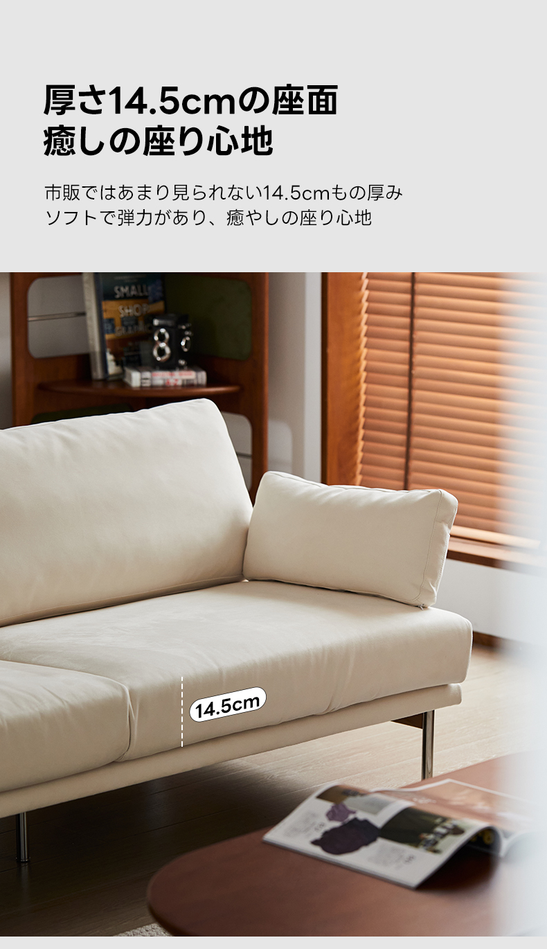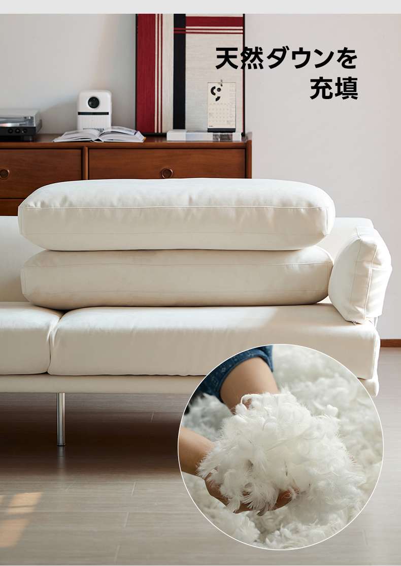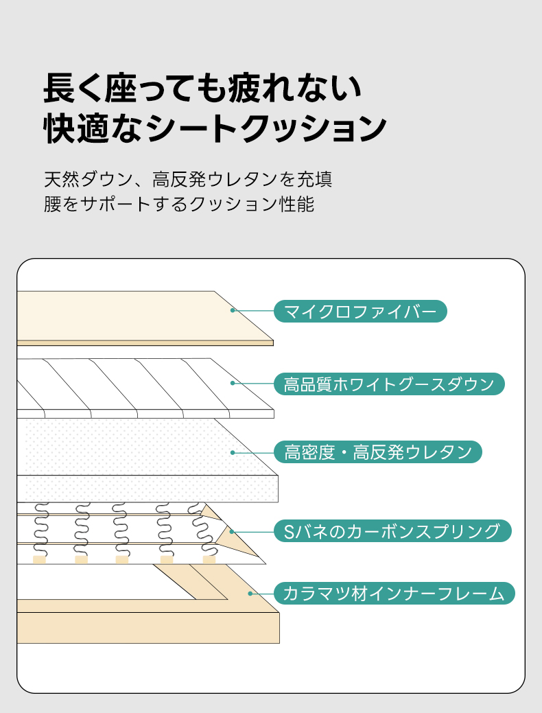- 【快適な座り心地】天然ダウンと高反発ウレタンを使用したクッションは、長時間座っても疲れにくく、体をしっかりサポートします。厚さ14.5cmの座面は、柔らかさと弾力性を兼ね備えています。