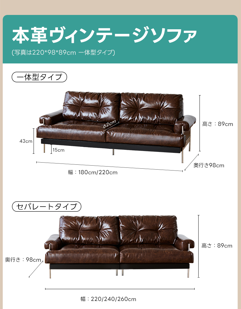 - 【カスタマイズ可能なデザイン】この本革ヴィンテージソファは、個々のニーズに応じてカスタマイズが可能です。選べる素材や色のバリエーションが豊富で、あなただけのオリジナルデザインを実現します。