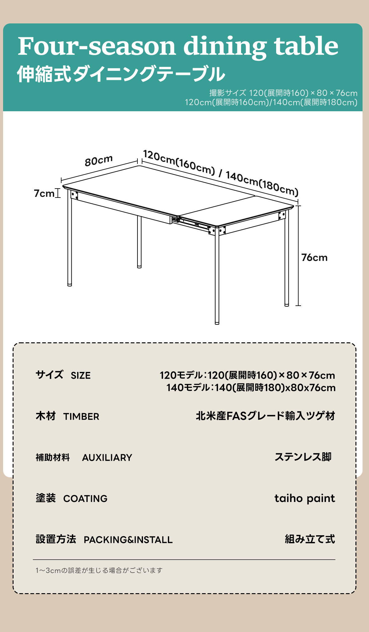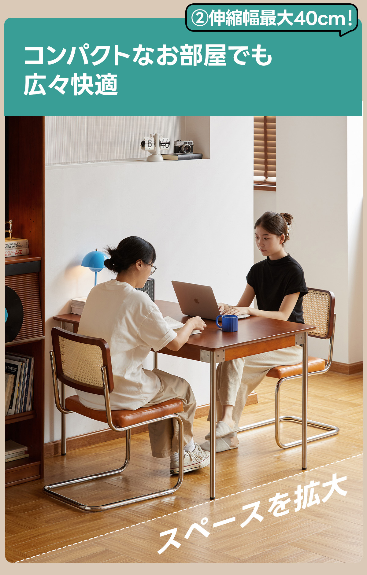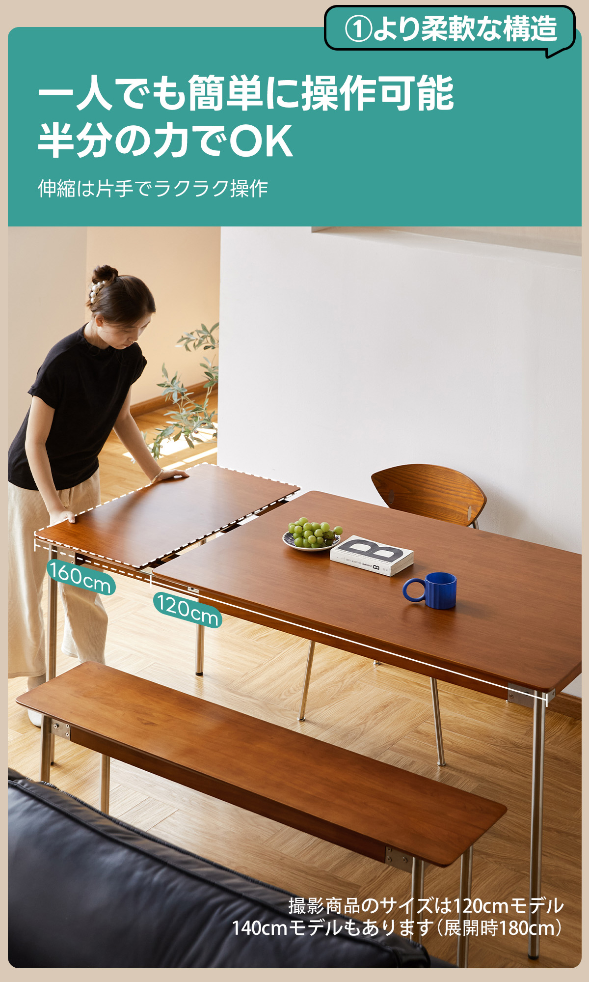 - 【優れた機能性】この伸縮式ダイニングテーブルは、120cmから160cm、140cmから180cmまで自由にサイズを調整可能。コンパクトなスペースでも広々と使用でき、カップルやファミリーに最適です。