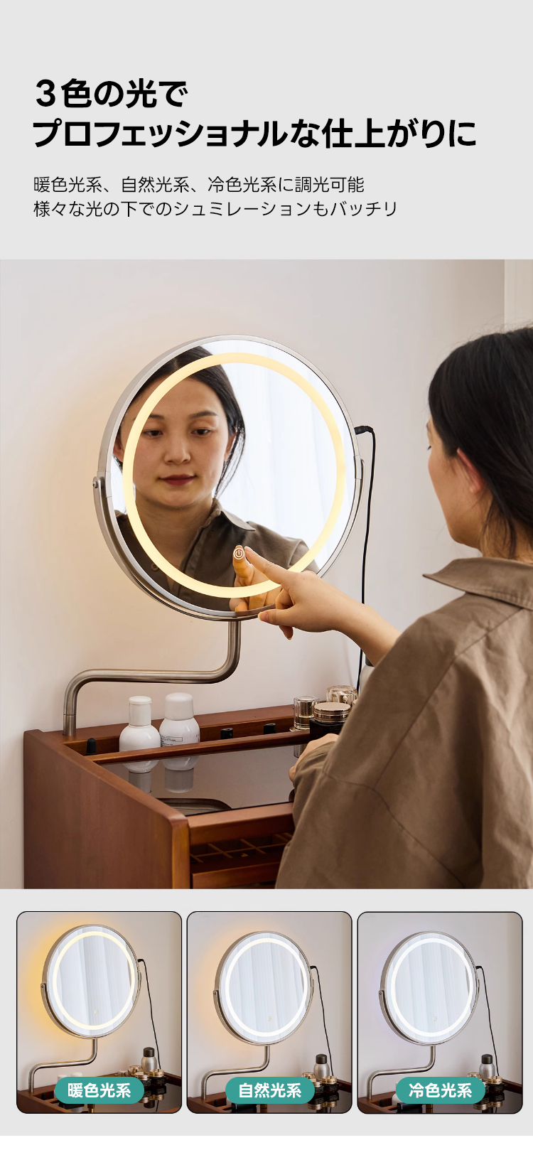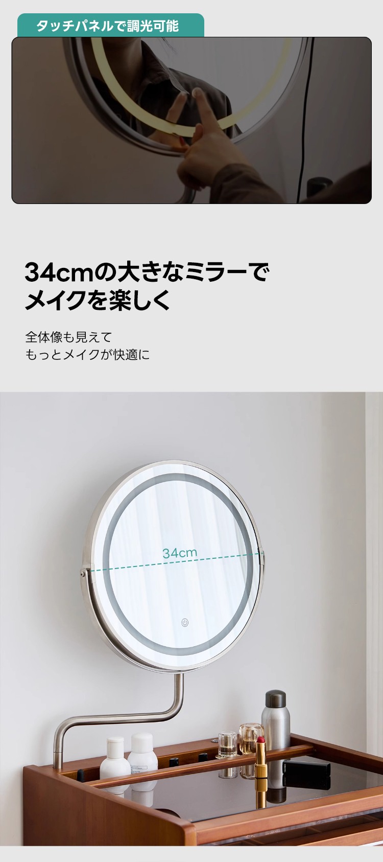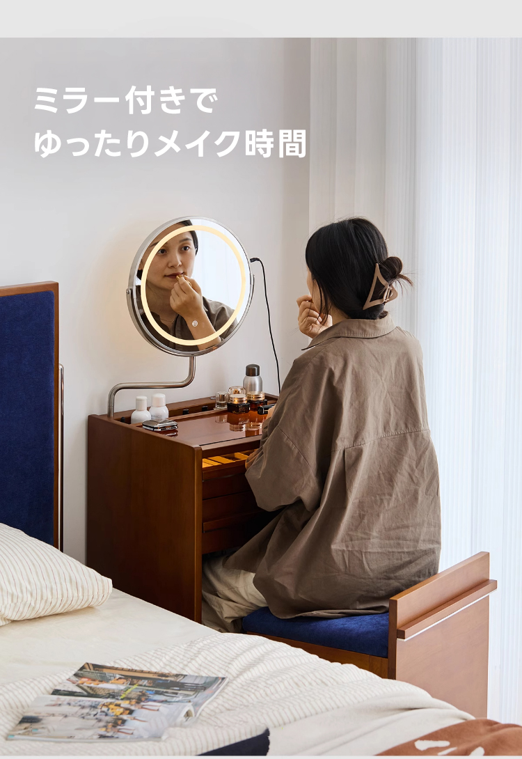 - 【多機能ミラー付きでメイクアップが快適】:34cmの大きなミラーは、角度調整可能で3色のライトを備えています。暖色、自然光、冷色をタッチパネルで簡単に切り替えられるため、理想的なメイクアップ環境を提供します。