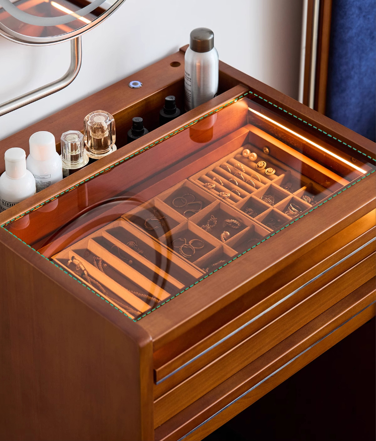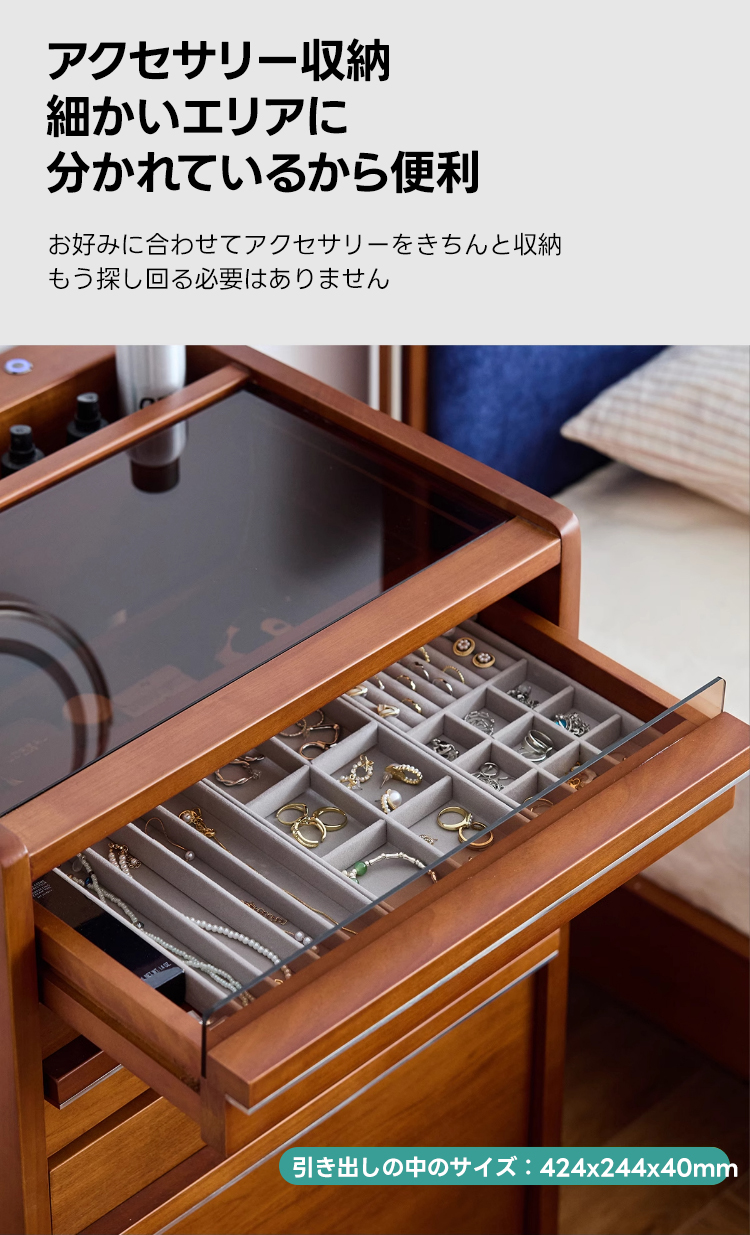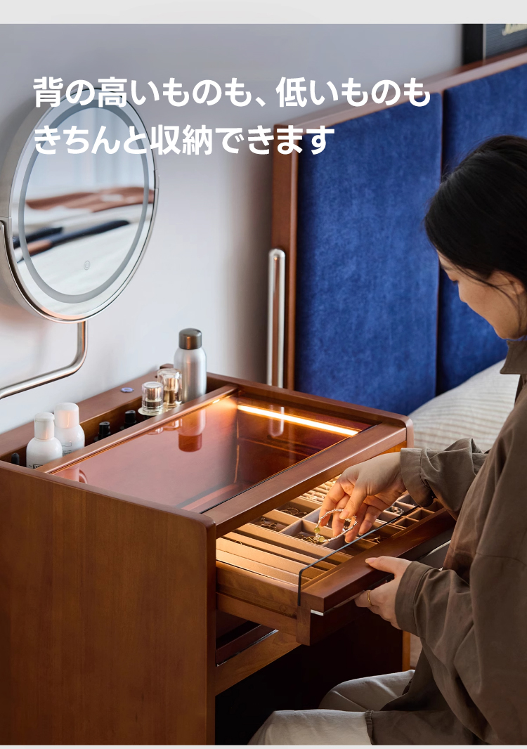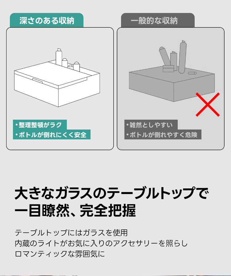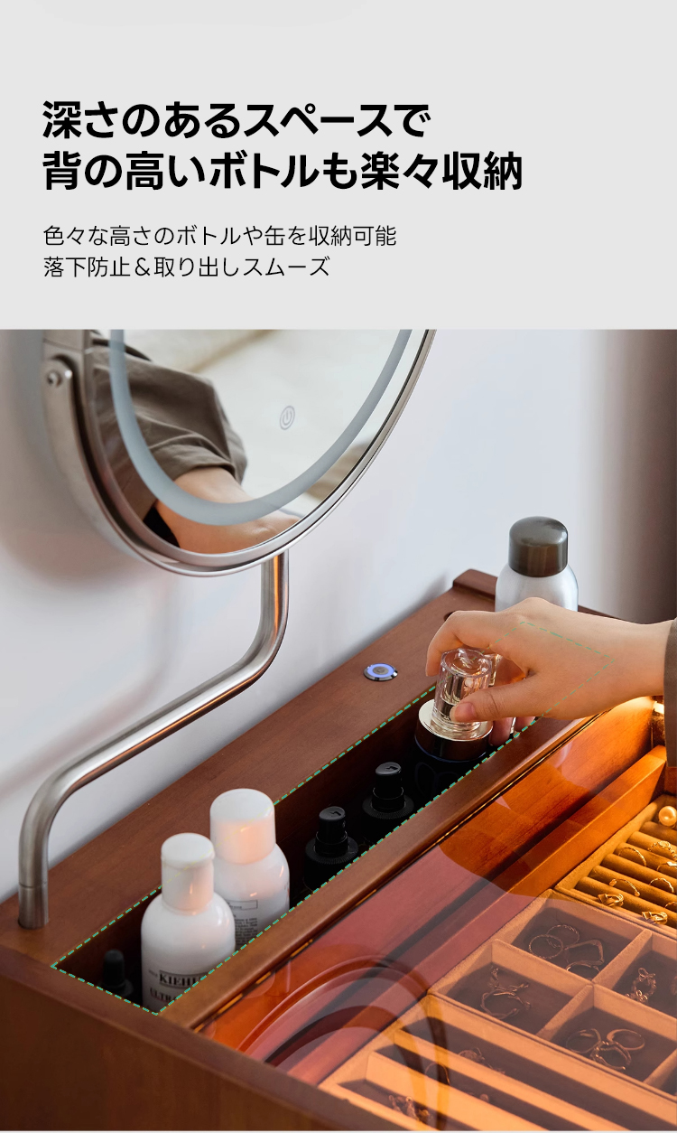 - 【優れた収納力で整理整頓が楽】:ネックレスやアクセサリー用の細かい仕切りがあり、整理整頓が簡単です。深さのある収納スペースには、背の高いボトルも安全に収納可能で、すっきりとした空間を保てます。