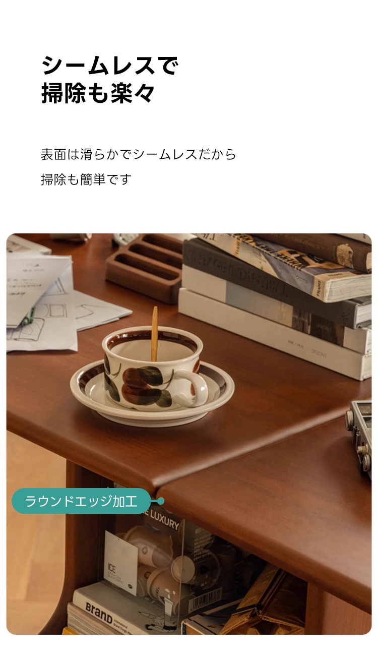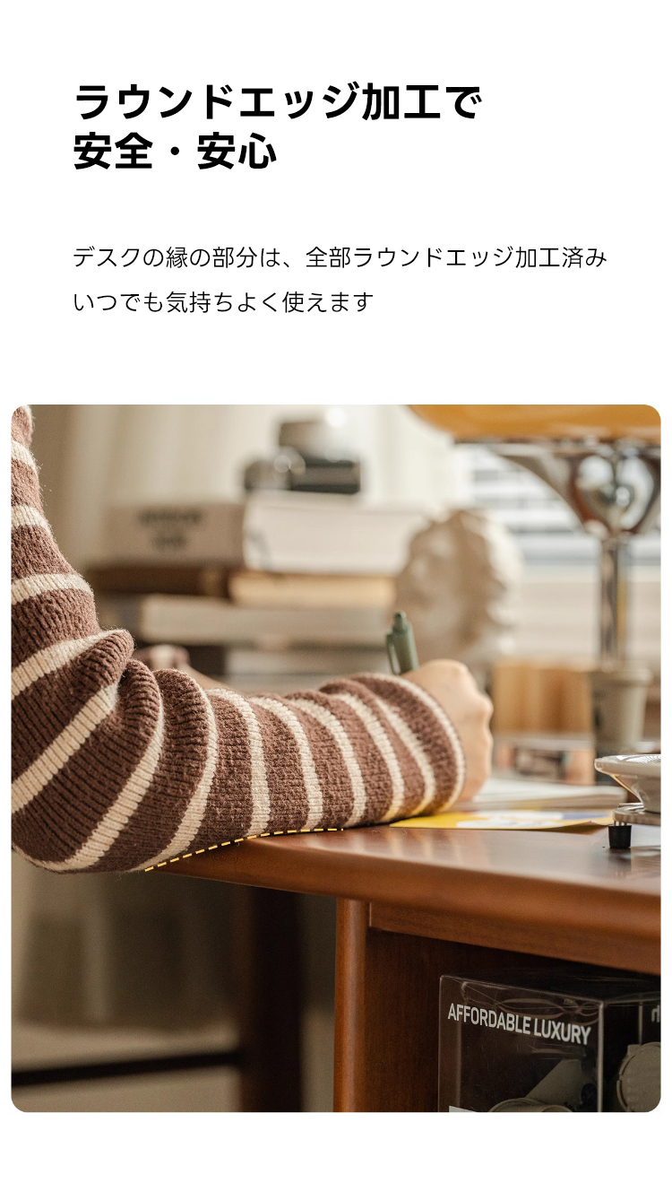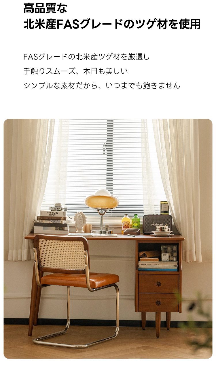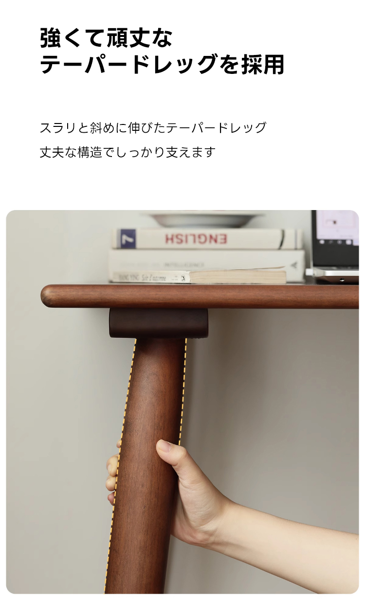 - 【高品質なツゲ材と洗練されたデザイン】北米産FASグレードのツゲ材を使用し、手触りが滑らかで美しい木目が特徴です。ラウンドエッジ加工が施されており、安全性が高く、安心して使用できます。強くて頑丈なテーパードレッグがデスクをしっかり支え、安定感があります。