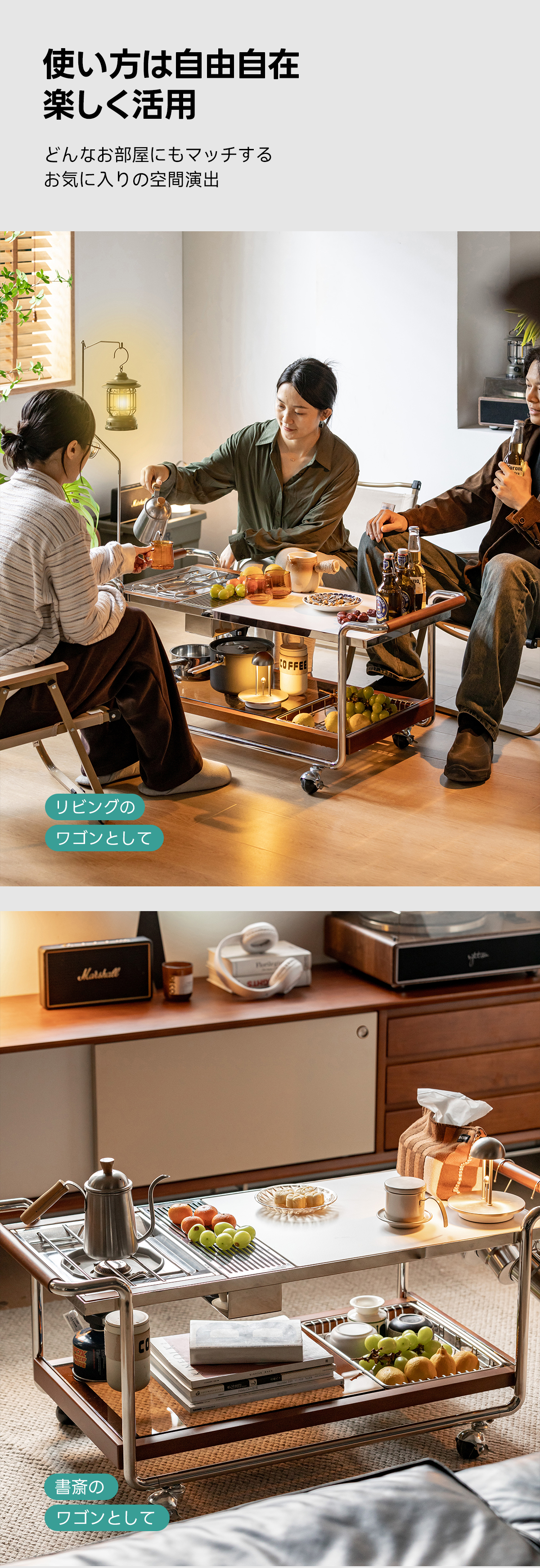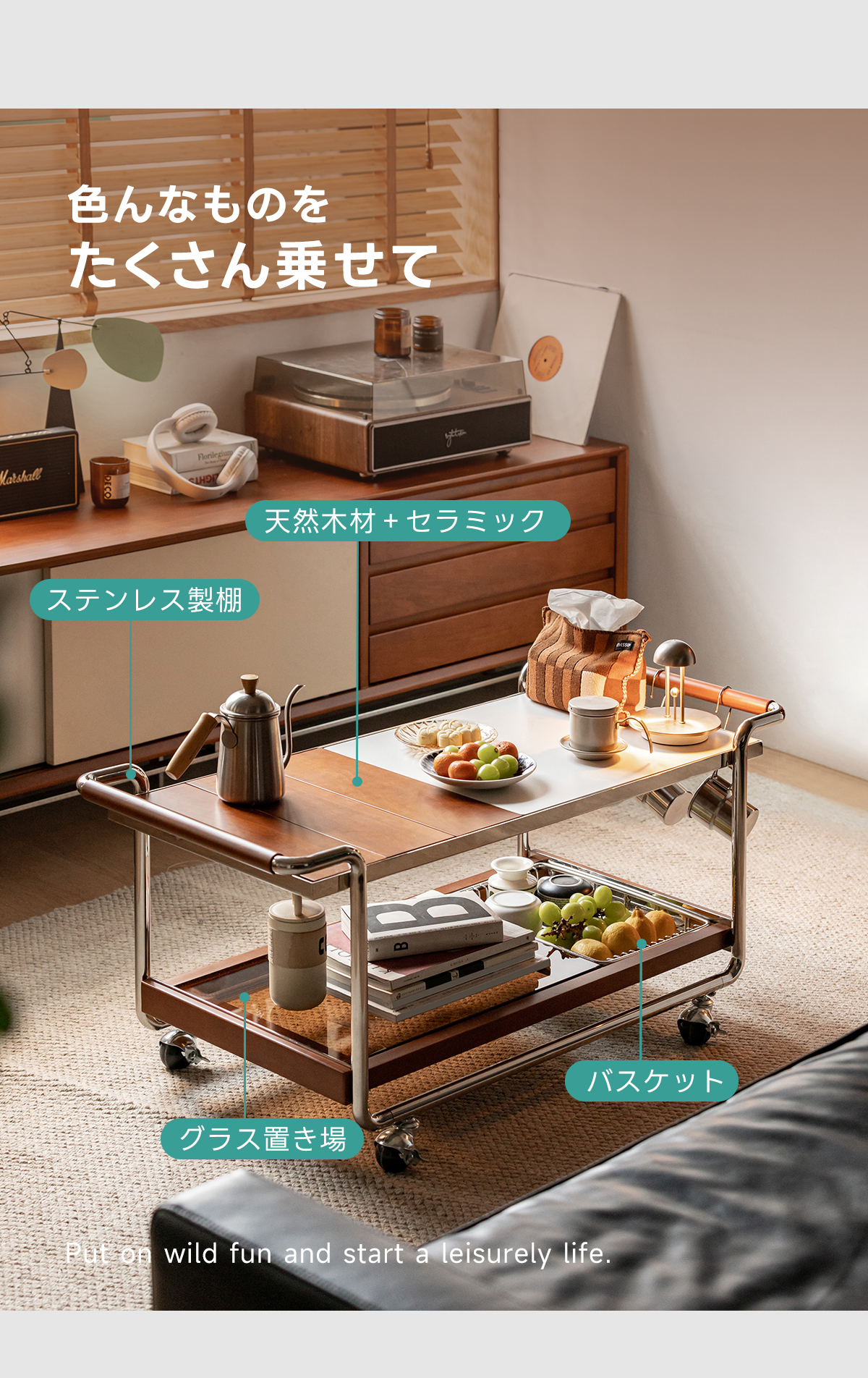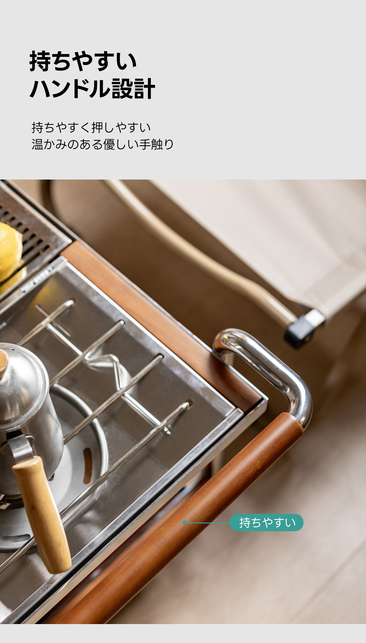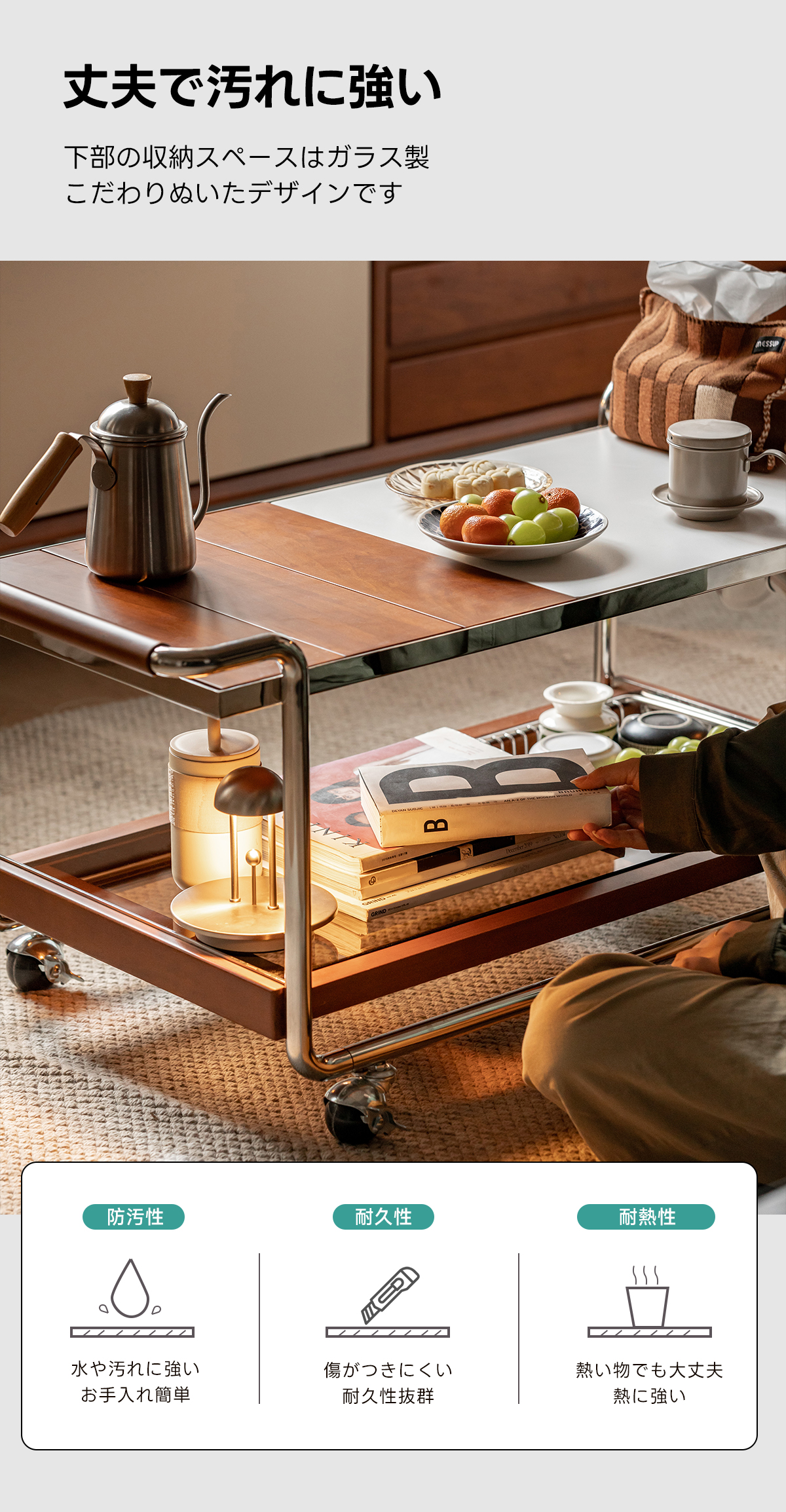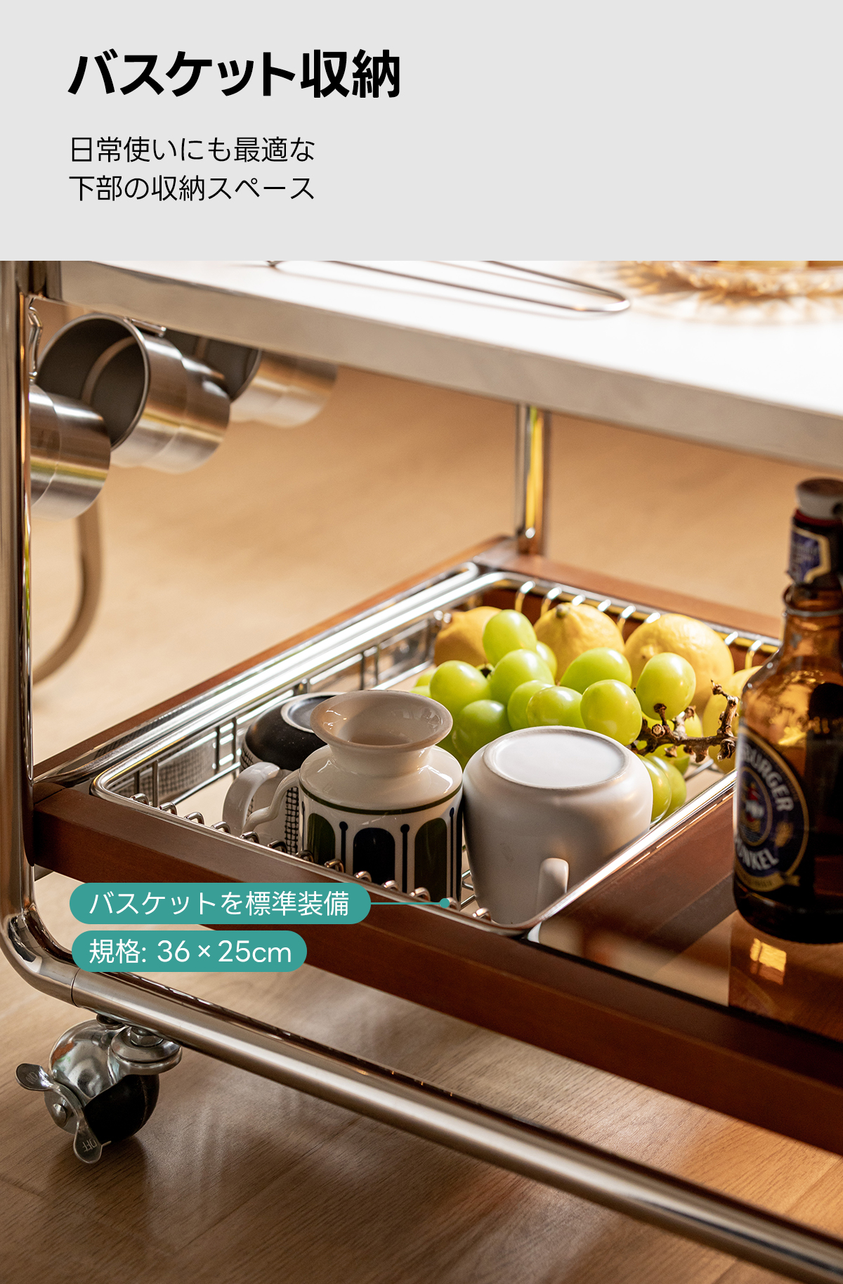 - 【快適な使用体験】ストッパー付きのキャスターで、必要な場所へすぐに移動可能。持ちやすいハンドル設計で、使い勝手も抜群です。下部にはガラス製の収納スペースがあり、食器や食材をすっきりと収納できます。