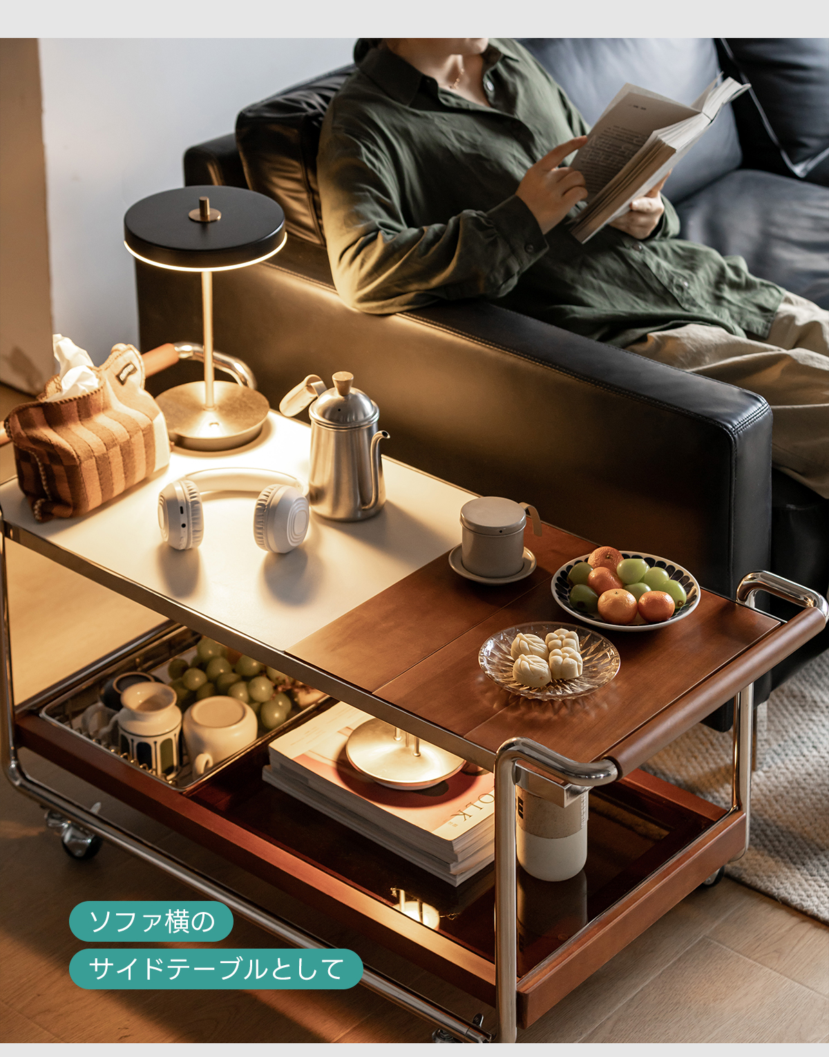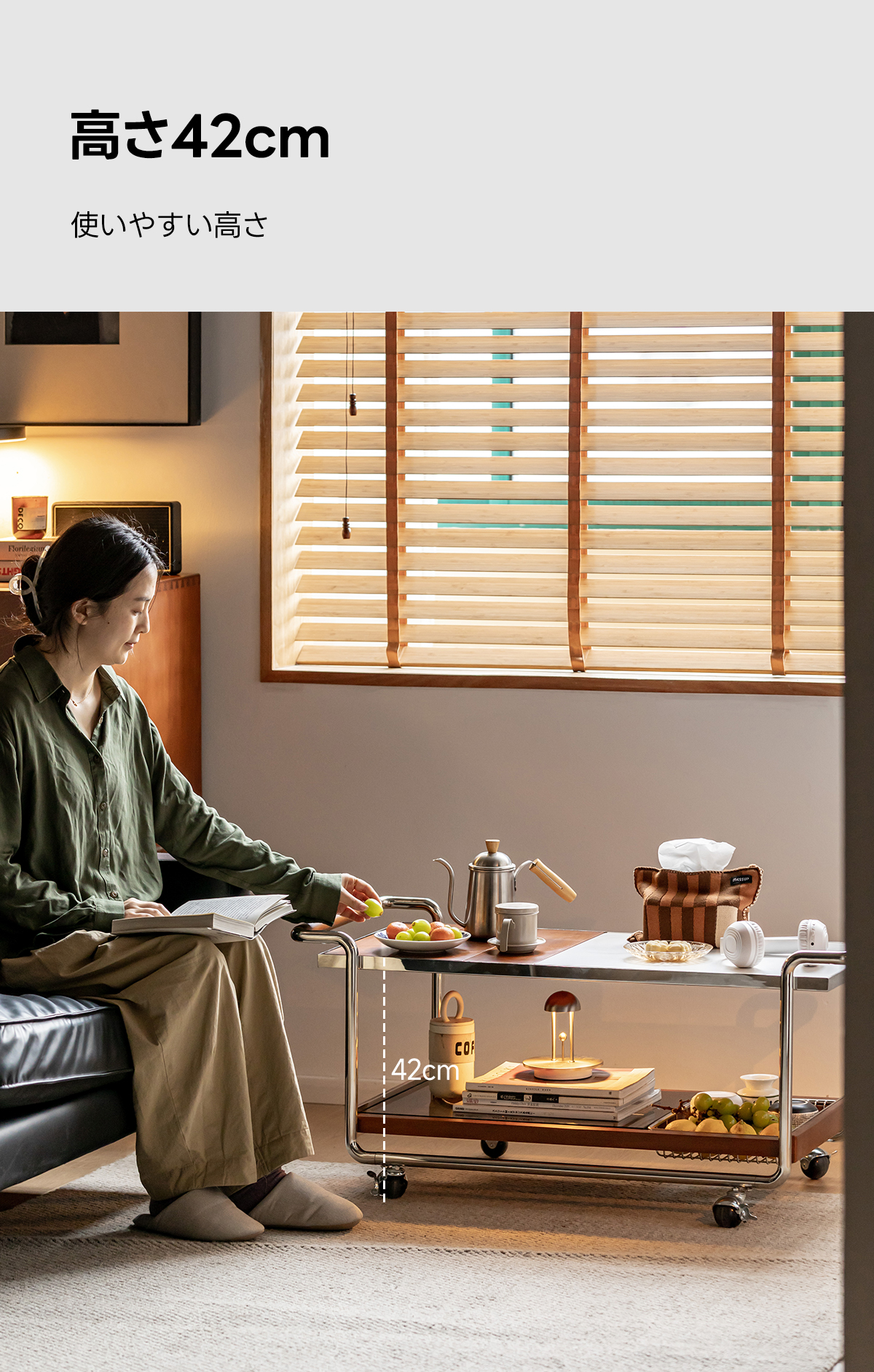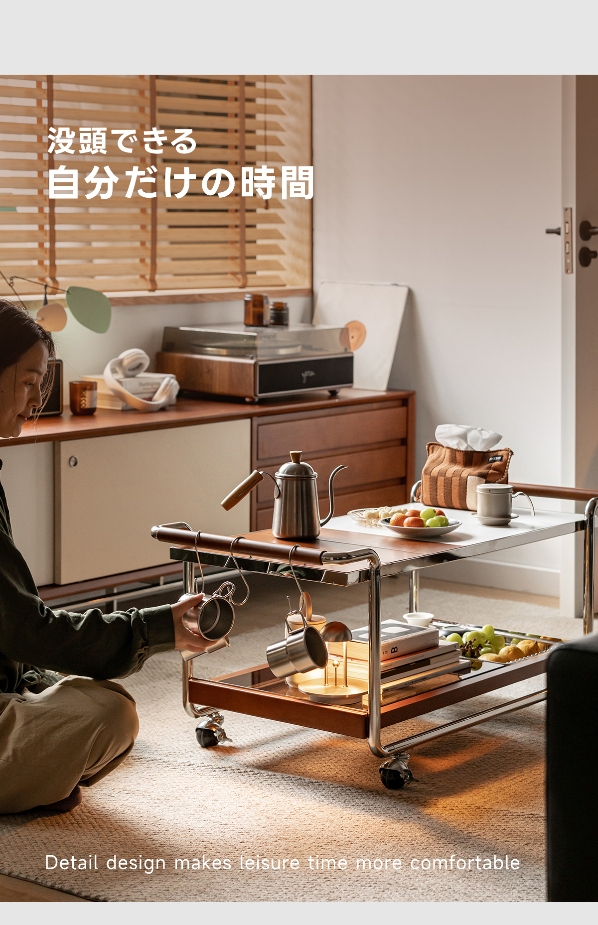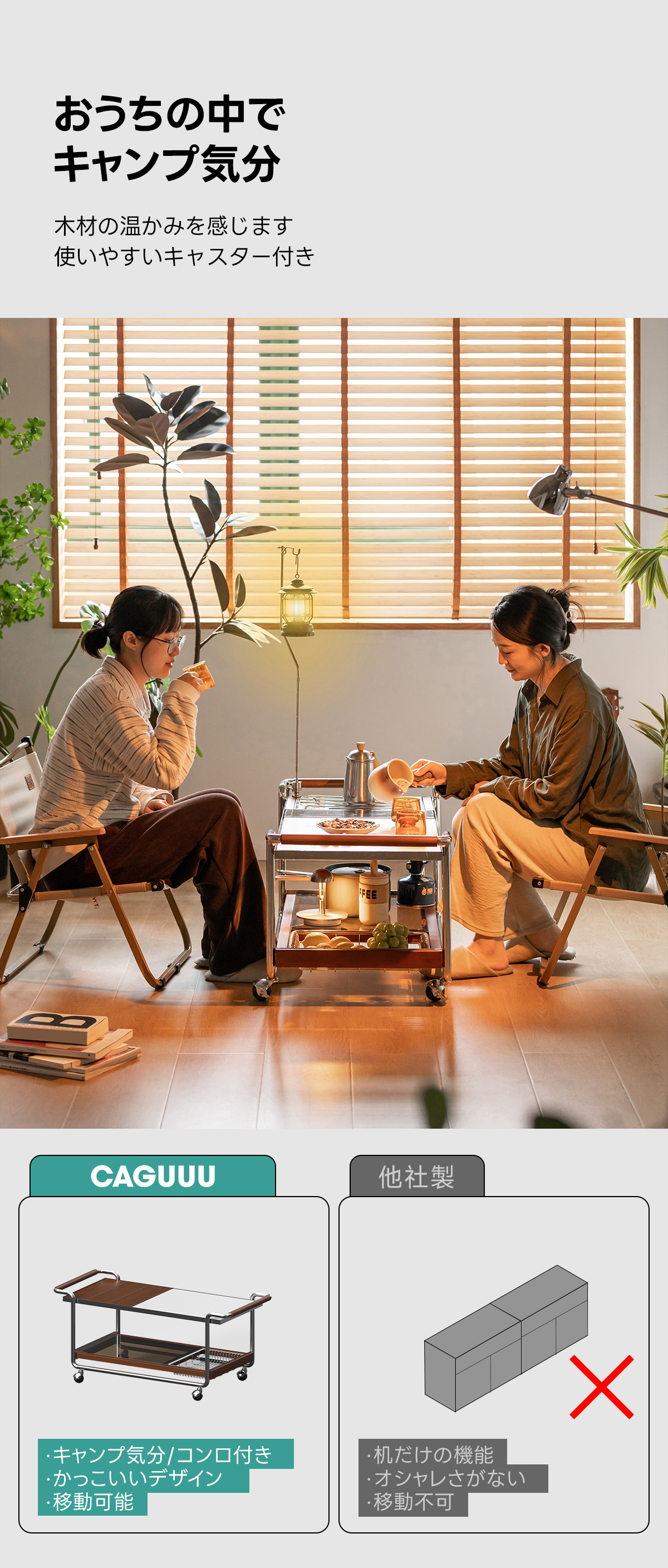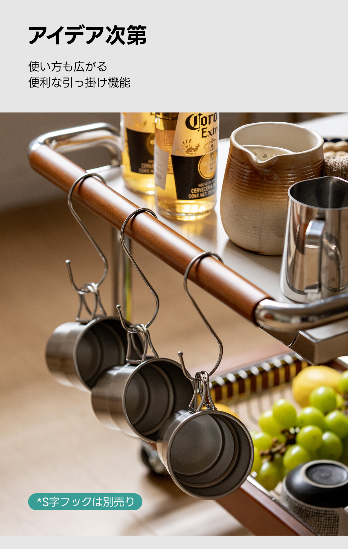 - 【快適な使用体験】ストッパー付きのキャスターで、必要な場所へすぐに移動可能。持ちやすいハンドル設計で、使い勝手も抜群です。下部にはガラス製の収納スペースがあり、食器や食材をすっきりと収納できます。