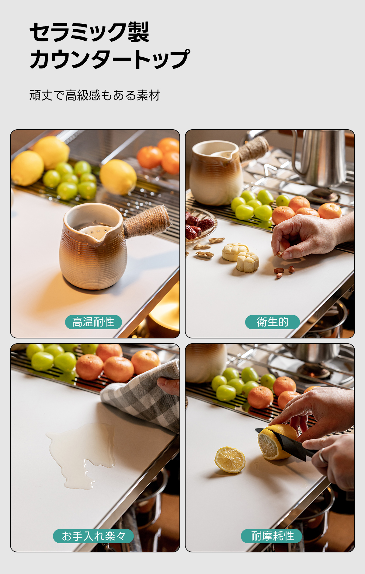 - 【高品質の材料とデザイン】北米産の高級ツゲ材を使用し、耐久性と美しさを兼ね備えています。セラミック製カウンタートップは高温耐性があり、衛生的でお手入れが楽です。木材の温かみが感じられるデザインです。