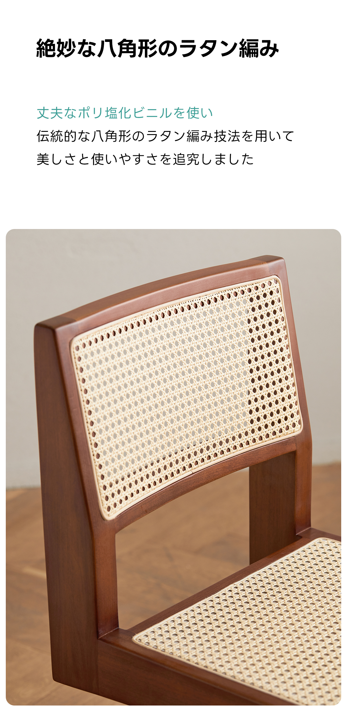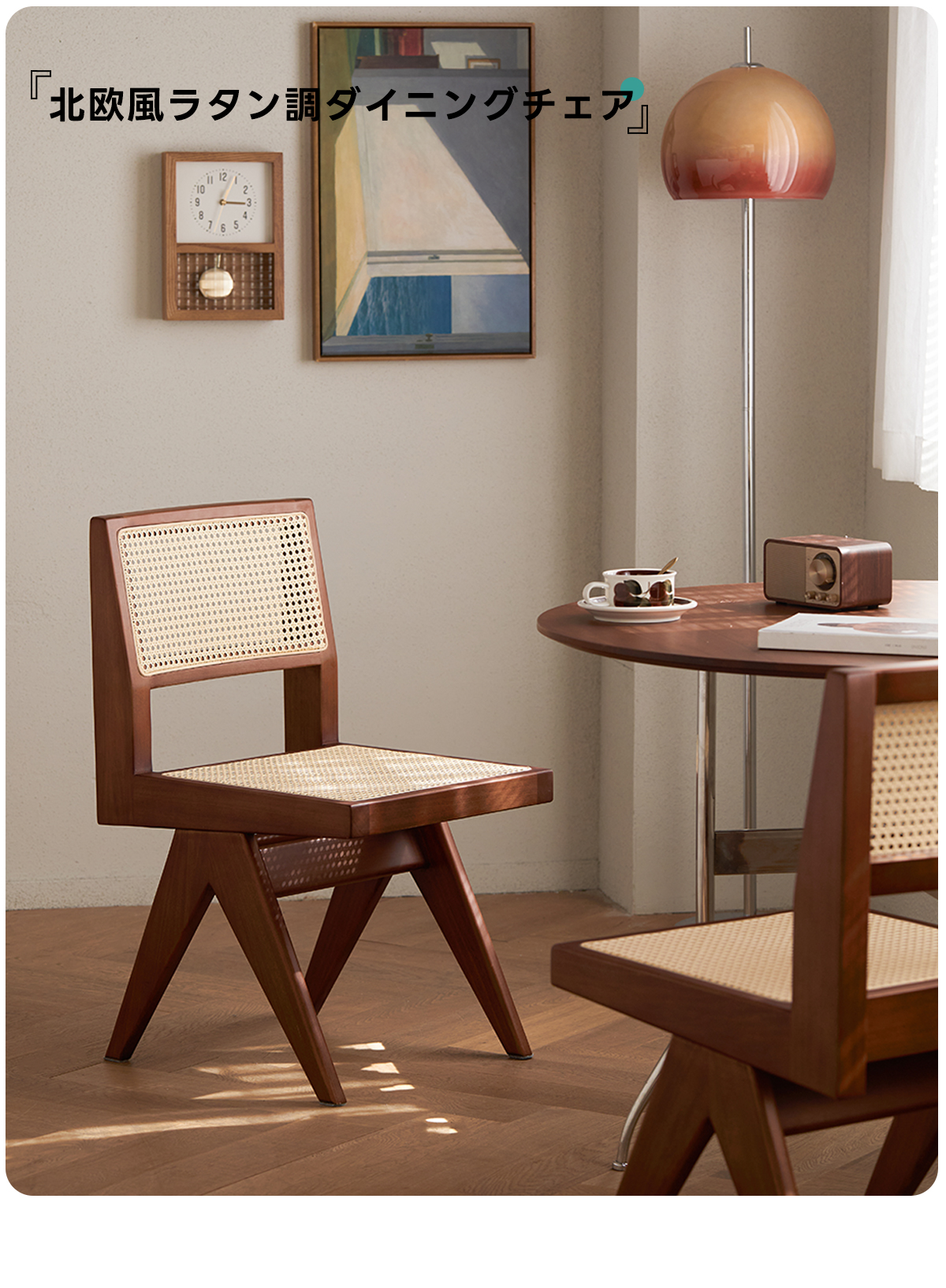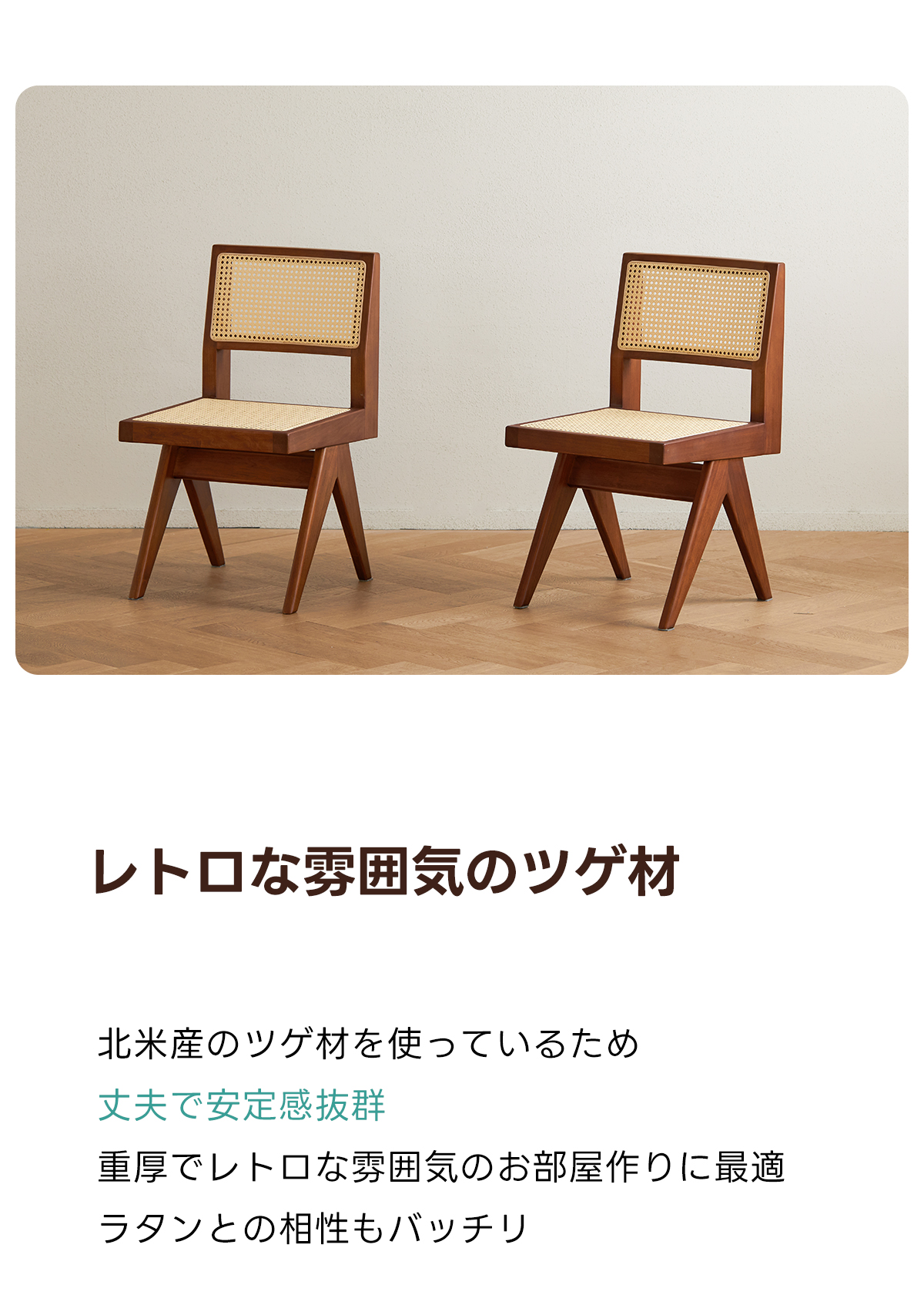 - 【優雅なヴィンテージデザイン】:北米産の高級ツゲ材を使用したラタン調ダイニングチェアは、ヴィンテージ感漂うデザインが特徴です。どんなインテリアにもマッチし、リビングやダイニングに優雅な雰囲気を演出します。